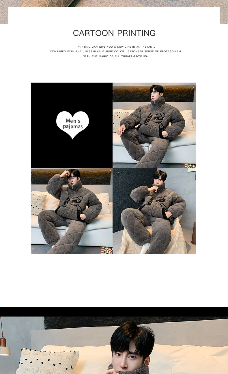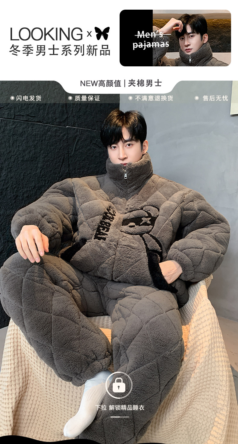 2026 New Autumn and Winter Men's Three-Layer Quilted Pajamas for Teenagers, Fleece-Lined and Thickened Coral Fleece Set, Loungewear