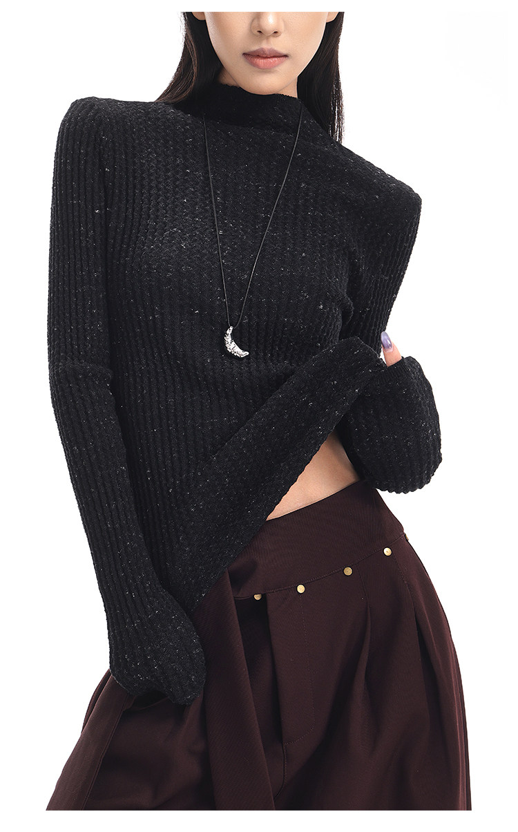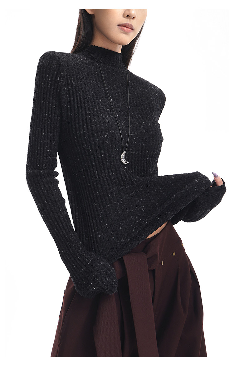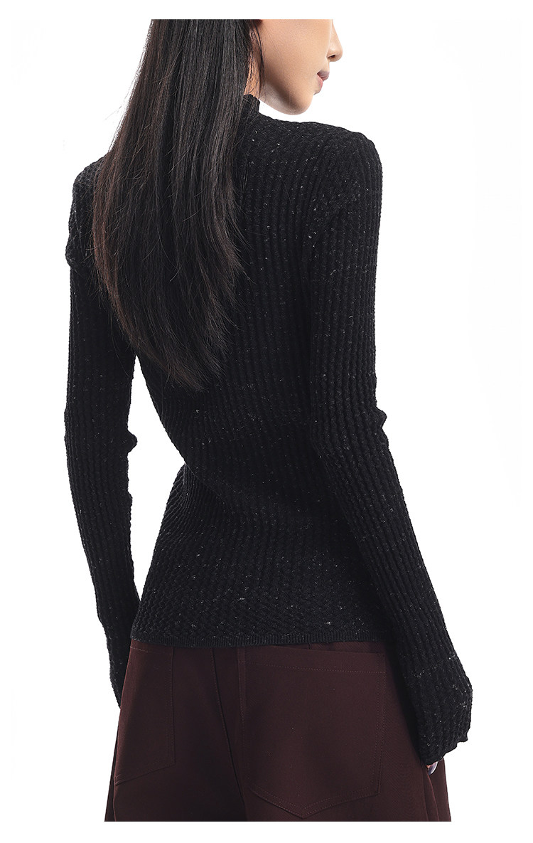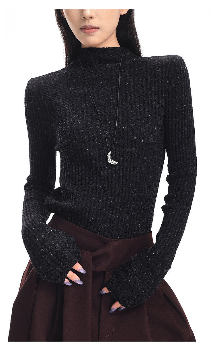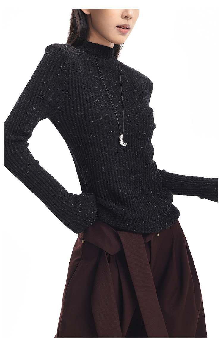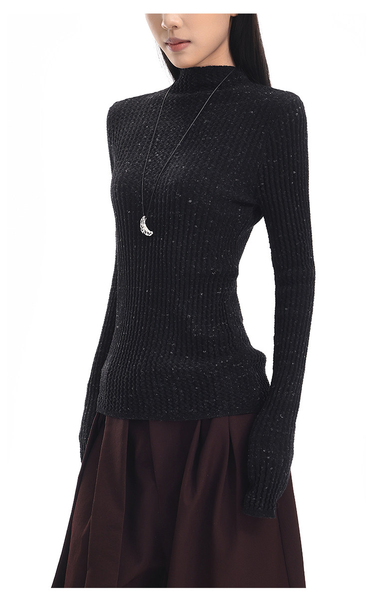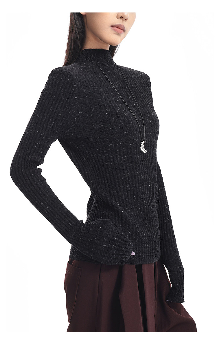 Ken Studio New Autumn and Winter Black Long-Sleeved Sweater for Women with Textured Half-High Collar and Slim Fit Inner Knitted Top