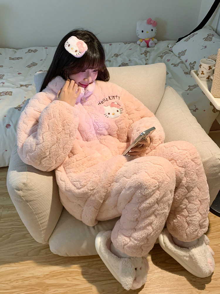 2025 new hellokitty coral velvet pajamas for women winter three-layer quilted plus velvet thickened cute home clothes