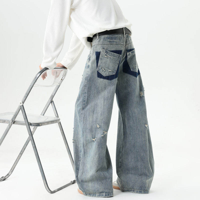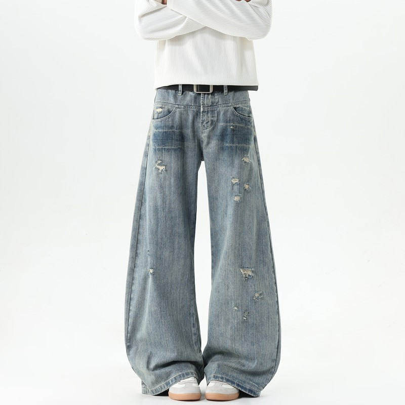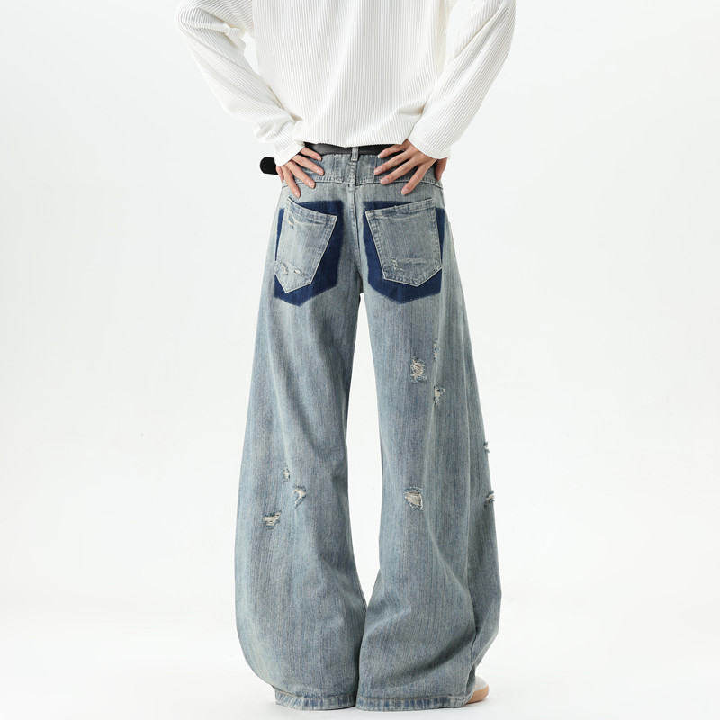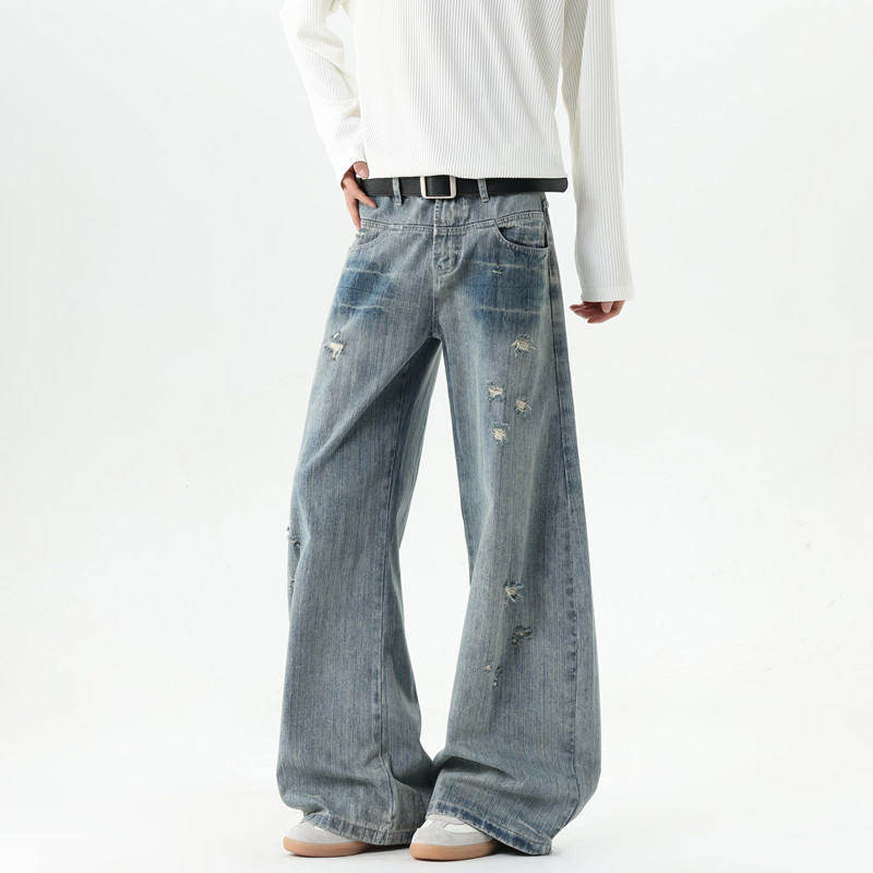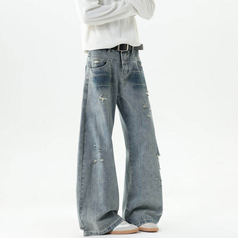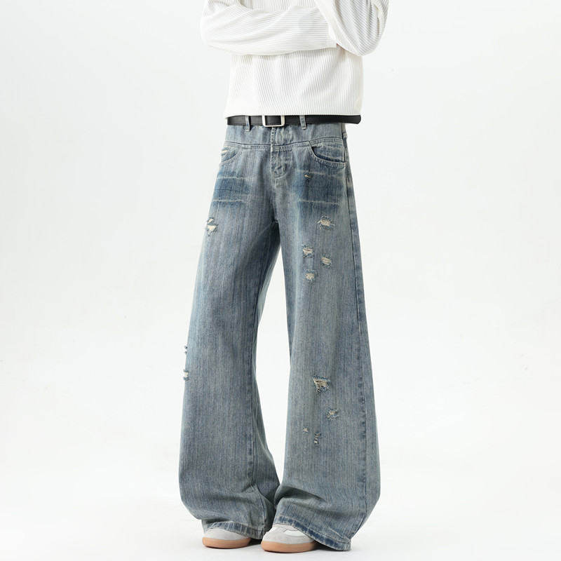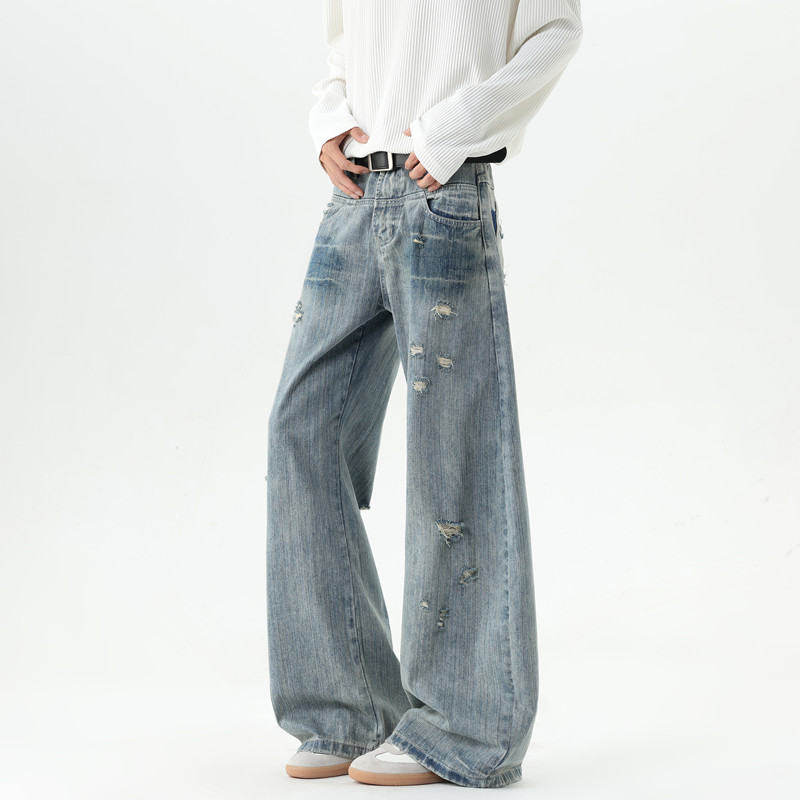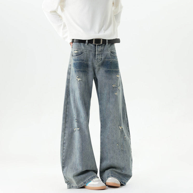 American style distressed ripped jeans for men in autumn and winter trendy brand loose wide-leg scimitar pants with design slightly flared floor-length pants