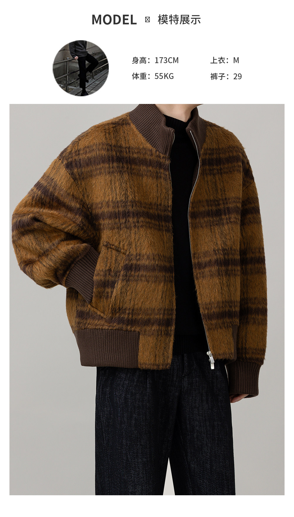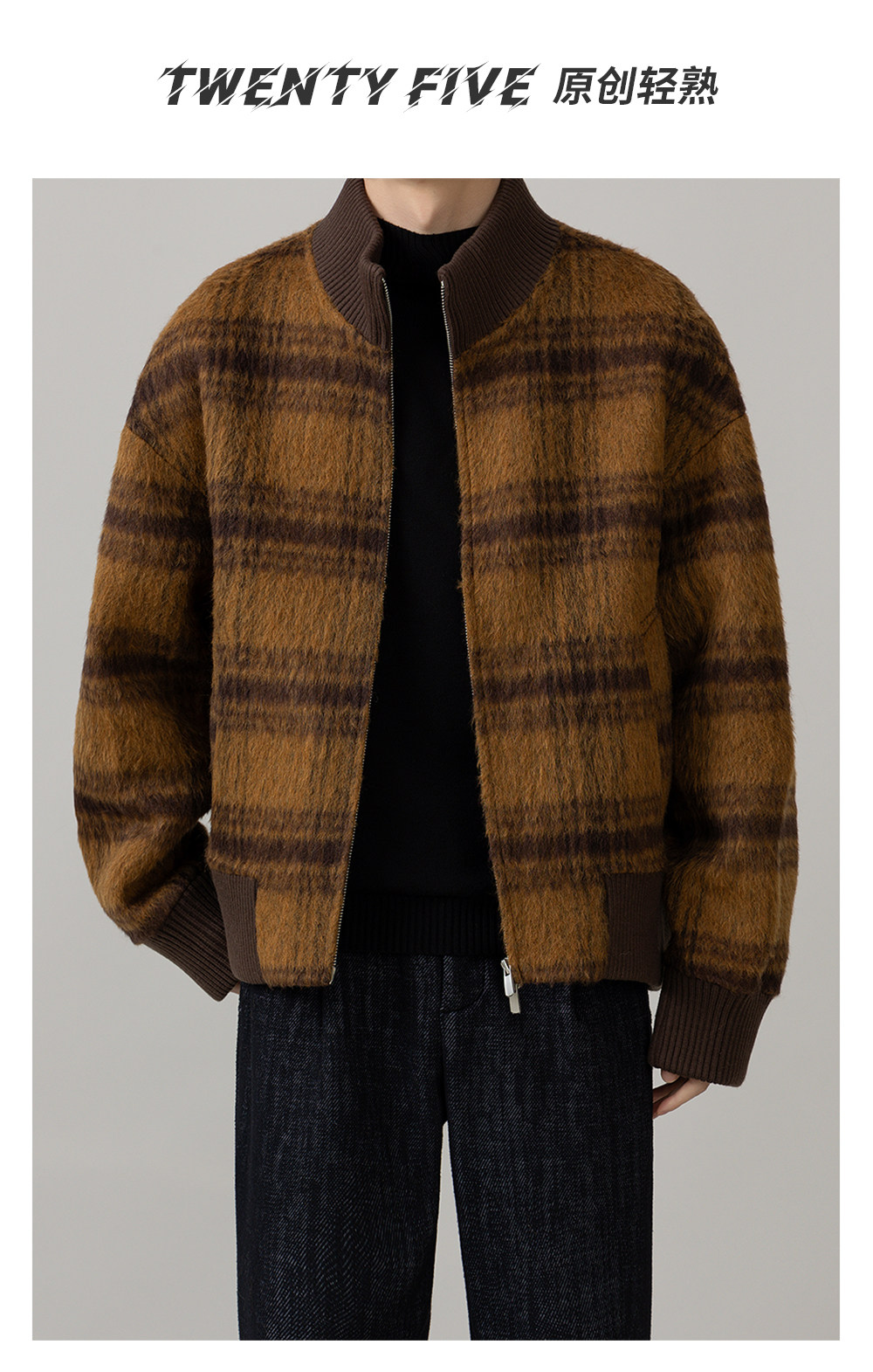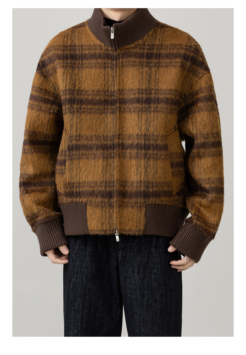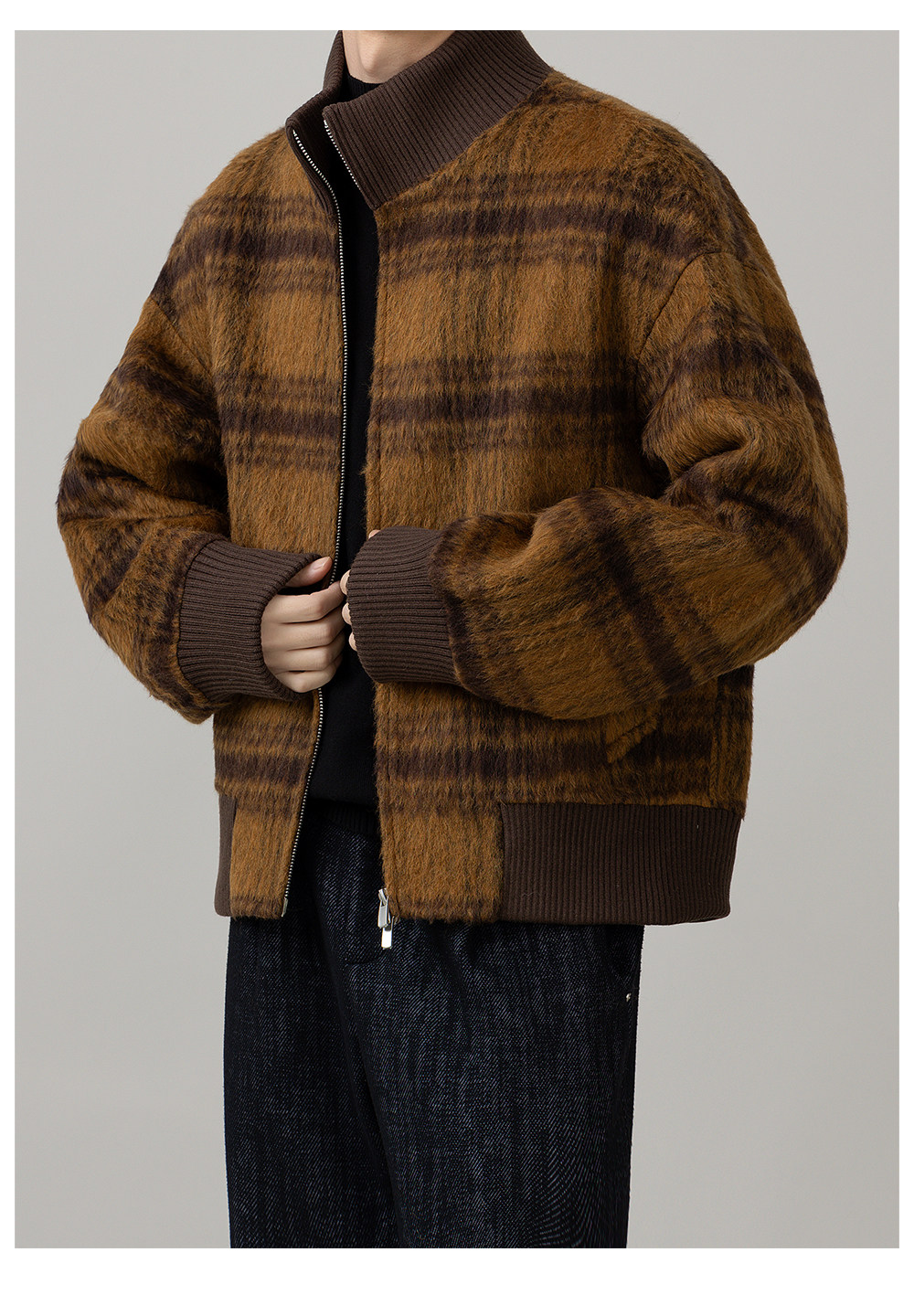 Retro Trendy Alpaca Blended Jacket Men's Stand Collar Handsome Loose Fashionable Autumn and Winter New Checkered Wool Jacket