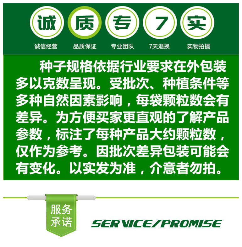 Sort by color 5 grams of four-season rapeseed, about 3,000 pieces (large, fast-growing plant),10 grams of four-season large-leaf spinach, about 1,000 pieces,About 2,000 pieces of Shanghai Chicken Feathers 10g (quick-growing),5 grams of glass lettuce, about 4,000 pieces (quick-growing),10 grams of four-season large-leaf coriander, about 1,000 pieces,Shanghai Qing 10g, about 2000 capsules (fast-growing large capsules),About 5 grams of four-season chives, about 1,000 pieces (soak seeds for 24 hours/germinate and sow),About 500 spicy chili peppers (spiciness level),About 50 fruit cucumbers (dry cucumbers),About 25 safflower kidney beans,Pick about 40 pieces of long beans that are as beautiful as jade (green green beans),Crispy croissant/sweet melon croissant, about 70 pieces,About 50 pieces of yellow and green okra,About 30 pieces of early green zucchini,About 40 early-ripening green beans without racks,High-yielding frameless long cowpeas, about 40 pods,About 40 red beans without racks,Pressure stand/about 30 small five-leaf long cowpeas (green and white beans),10 grams of willow-leaf water spinach, about 200 pieces (likes water and fertilizer),About 50 green-flesh long cucumbers,About 300 pieces of purple eggplant/black eggplant,High-yielding large tomatoes, about 200,About 200 red cherry tomatoes,About 200 yellow cherry tomatoes,10 grams of creamed cabbage, about 2,000 pieces (quick-growing),Italian bolting-resistant lettuce 5g, about 4000 pieces (fast-growing),10 grams of Sijiu Beet Hearts, about 2,000 pieces (fast-growing/multiple harvests),About 500 pieces of Fengkang 90 Shandong Chinese cabbage (medium-early maturing/high yield/best economical),Huangxin Wutaicai 5g, about 1000 pieces,Jiu Jin Jin is equal to 0.5 kilograms. 5 grams of king white radish is about 400 pieces (high yield),Cherry radish 5g, about 400 pieces,Dahongpao radish 5g, about 400 pieces,Chrysanthemum chrysanthemum 10g, about 3000 capsules,10 grams of farm spinach, about 1,000 pieces,About 50 cucumbers lazily crawled,Kirin Watermelon 84-24, about 40 pieces,About 25 early-maturing small winter melons,About 20 green beibei pumpkins,About 20 red chestnut pumpkins,About 30 large honey pumpkins,Golden Hook Pumpkin 5g, about 30 pieces,About 30 long fragrant loofahs,About 100 sweet melons,About 100 white melons,3 grams of large-leaf fungus, about 100 pieces (likes heat and water and fertilizer/can climb vines),About 2,000 pieces of butter lettuce (quick-growing),5 grams of butter cabbage moss, about 1,000 pieces (fast-growing/multiple harvests/good commercial properties),About 2,000 green lettuce (high yield),About 2,000 pieces of red lettuce (strong flavor),Suzhou Qinghei Big Head 10g, about 2000 capsules,About 100 thin-skinned pickled peppers (hotness level),Spicy Erjin Approximately 500 capsules (spiciness level),About 300 large tomato bell peppers (spiciness level 0),A little red amaranth, about 2,000 pieces,About 300 delicious horn peppers (hotness level),10 grams of four-season red cabbage moss, about 2,000 pieces (fast-growing/large tree/multi-crop harvest),About 300 pieces of old variety purple canned eggplant,About 200 broccoli flowers (germinate first and then sow),Long-ribbed/eight-ribbed loofah 5g, about 30 pieces,About 30 pieces of short fat pork loofah,About 500 8819 line peppers (spicyness),About 200 crispy and tender Hangzhou peppers (spiciness level),About 200 spicy screw peppers,About 100 pieces of Bingtang Tianbao melon,About 100 melons,About 100 emerald melons,About 1,000 mosaic/cherry chicory leaves (salad vegetables),Early-maturing yellow cabbage, 5g, about 800 pieces,Rock Sugar Crisp/Shawo Fruit Green Radish 5g, about 400 pieces,About 200 pieces of pineapple fruit radish (rare trial size),About 45 sweet and crispy snow peas ,About 45 sugar snap peas ,Delicious pea sprouts/green sprouts 15g, about 60 pieces,About 10 purple-edged eyebrow beans,About 10 purple eyebrow beans/zixia eyebrow beans,About 10 green eyebrow beans/Qingxia eyebrow beans,About 25 pieces of nine-grain white/white evergreen beans,About 50 Muma mountain sweet potatoes,10 grams of cut fennel, about 1500 pieces,Romaine lettuce and peacock lettuce, about 2,000 pieces,About 2,000 heads of head lettuce,Green Rosa American large lettuce, about 2000 pieces,About 200 pieces of green cabbage,About 35 strawberry mini corns (for viewing and eating),About 100 potted red pearl tomatoes (dwarf),About 100 potted yellow pearl tomatoes (dwarf),About 100 potted black pearl tomatoes (dwarf),About 150 pieces of pagoda/beef heart cabbage,About 200 purple cabbage (non-GMO),About 200 pieces of cauliflower (germinate first and then sow),About 500 pieces of Fengkang 80 cabbage (medium-late maturing/firm balling/high vegetable cleaning rate),4 grams of red carrots, about 2,000 pieces,3 grams of yellow carrots, about 1500 pieces,About 1000 purple ginseng, fruit and carrots,About 400 pieces of white jade Yangzhou round white radish,About 400 pieces of Xinxinmei radish,Four Seasons Quick Vegetable 5g, about 1000 capsules,5 grams of four-season parsley, about 4,000 pieces (germinate first and then sow),5 grams of celery, about 4,000 pieces (germinate first and then sow),About 800 Zhangqiu hard-core green onions (germinate first and then sow),About 500 white-rooted and broad-leaf 791 leeks (high yield/germinate first and then sow),About 500 purple-root leeks (strong flavor/germinate first and then sow),About 500 red onions (germinate first and then sow),Sichuan vegetables 5g, about 1000 pieces,Chicken legs, kale 5g, about 1000 pieces,Tianjin Green Kohlrabi 5g, about 1000 capsules,Xuelihong 5g, about 1000 capsules,About 20 pieces of fragrant and tender gourd melon,About 2,000 pieces of purple peacock lettuce (rare),About 2,000 pieces of cream coffee lettuce (rare),About 2,000 pieces of purple leaf lettuce,Black leaf butter cabbage 4g, about 600 pieces,Yumeiren Milk Cabbage 4g, about 600 pieces,About 500 pieces of cabbage with egg yolk (super early ripening),About 500
