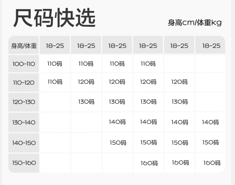 身高 90【建议身高75-85】,100【建议身高85-95】,110【建议身高95-105】,120【建议身高105-115】,130【建议身高115-125】