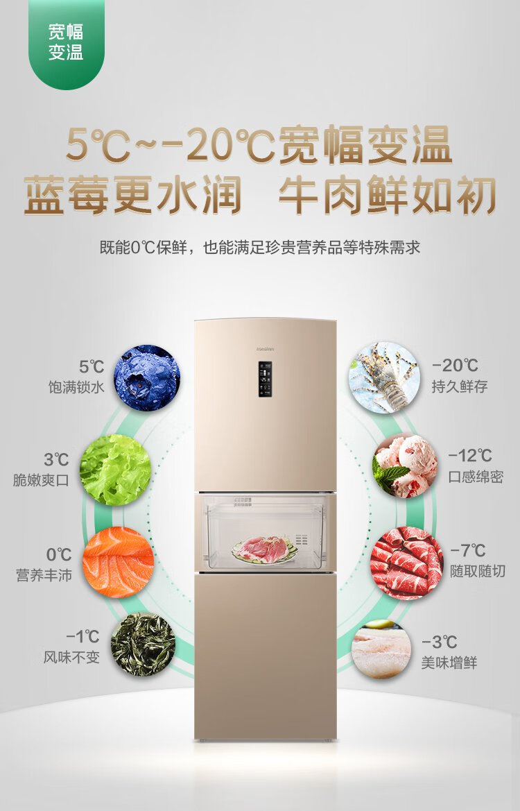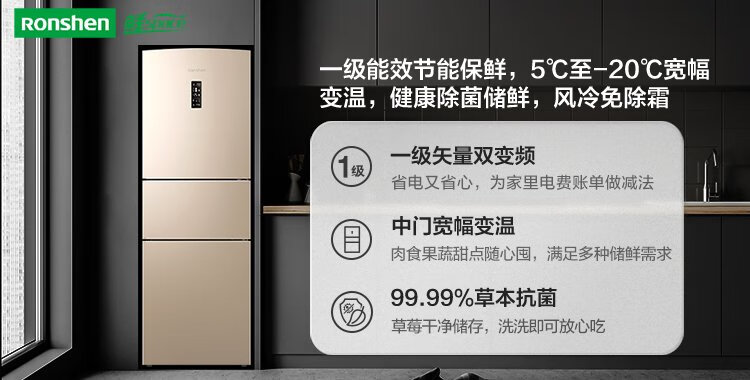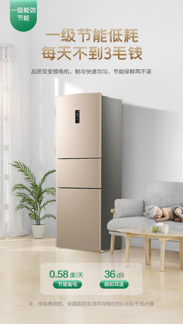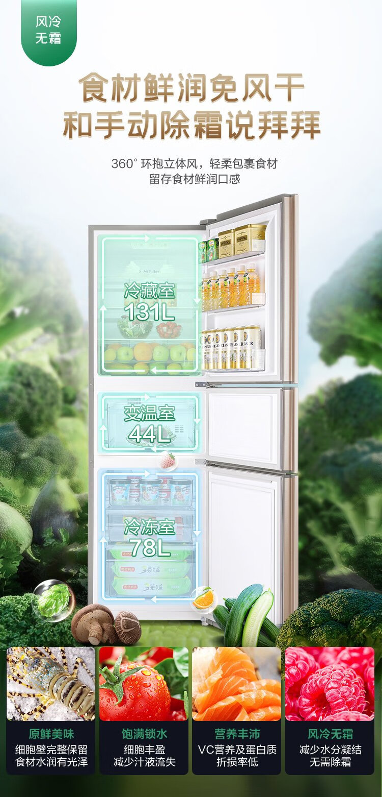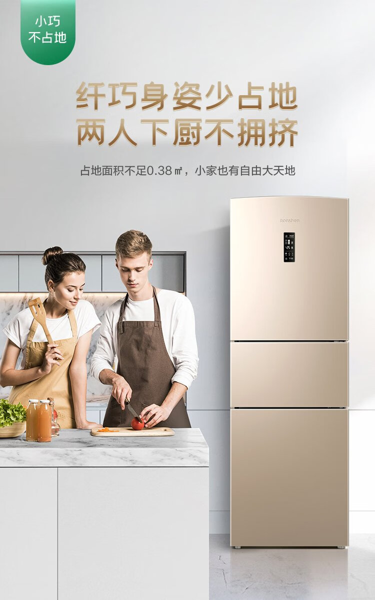 Rongsheng 253 upgraded first-class energy efficiency three-door small refrigerator household small air-cooled frost-free energy-saving rental dormitory BCD-253WD16NPA brilliant gold home appliances national subsidy