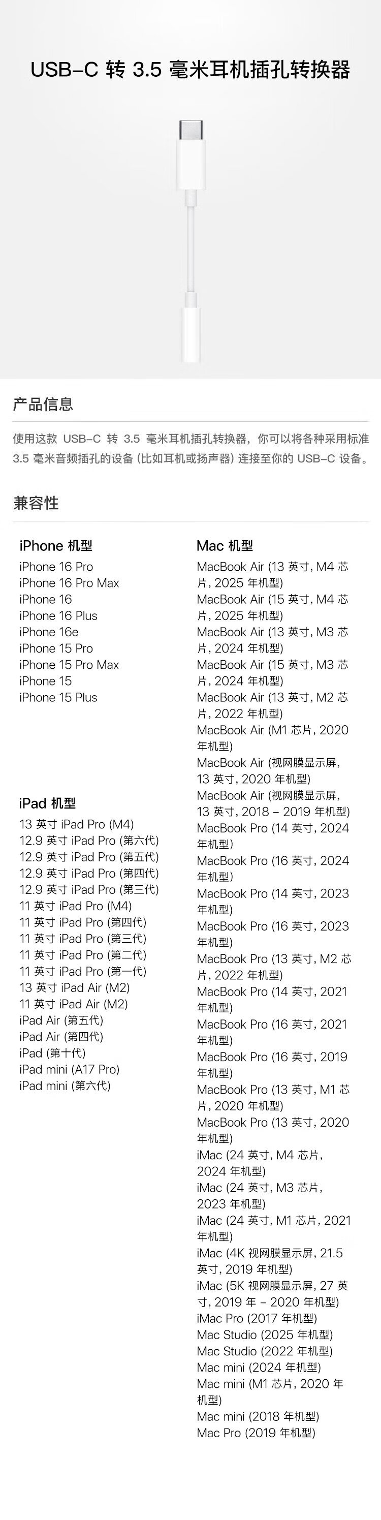 Apple/Apple wired headphone adapter 3.5 mm to USB-C/Typc-C interface, suitable for iPhone/iPad/Mac with USB-C interface