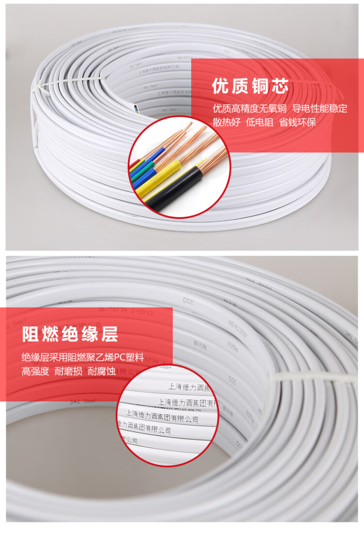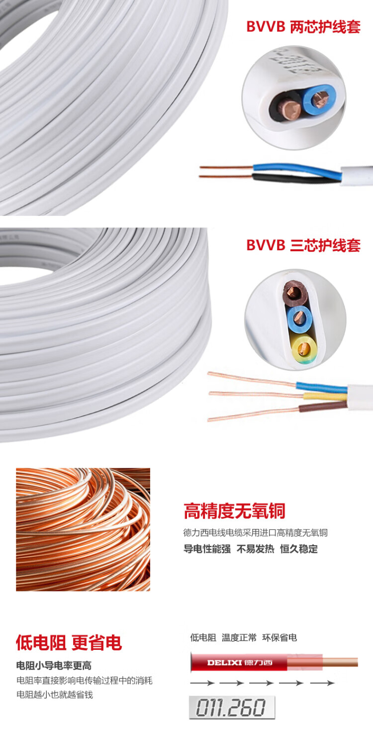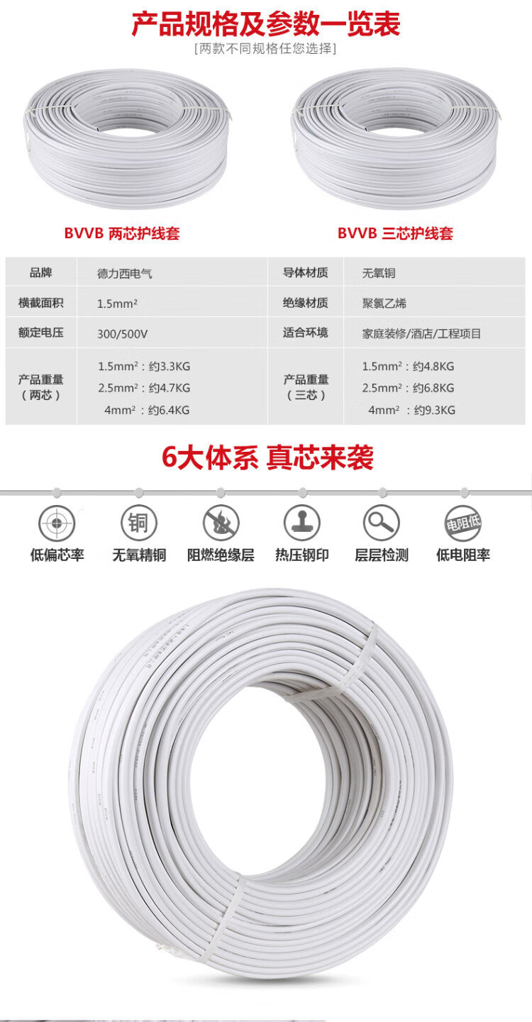 Delixi Electric BVVB flame retardant wire hard sheathed wire two-core 2.5 square socket copper core 50 meters white