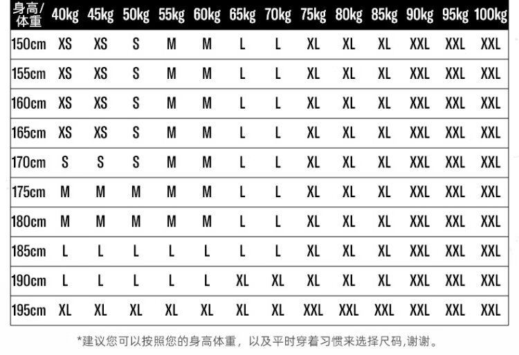 China (cm) 160-165/84-86 165-170 / 88-90 167-172 / 92-96 168-173 / 98-102 170-176 / 106-110