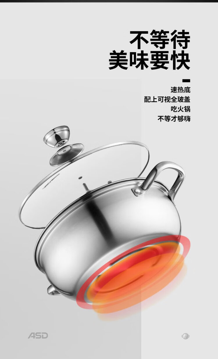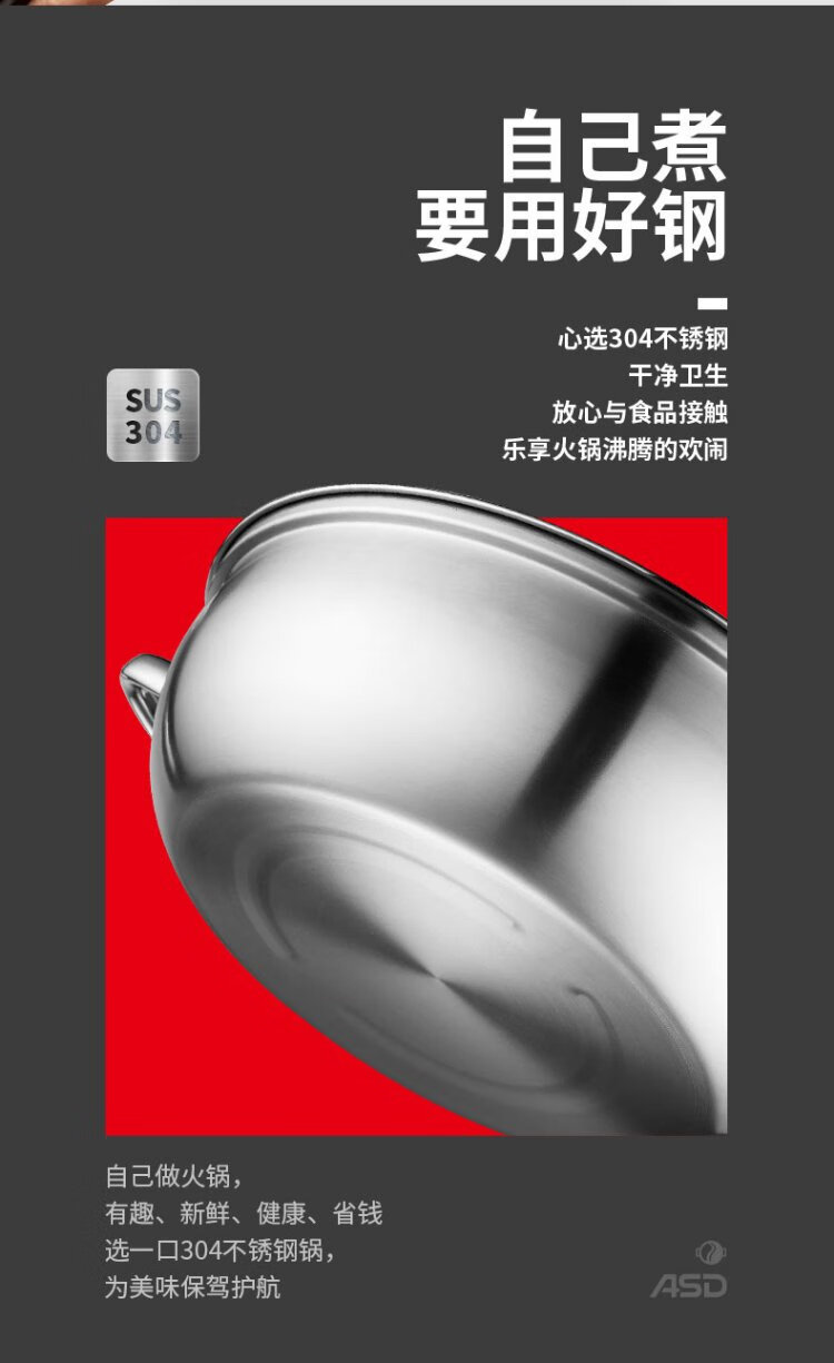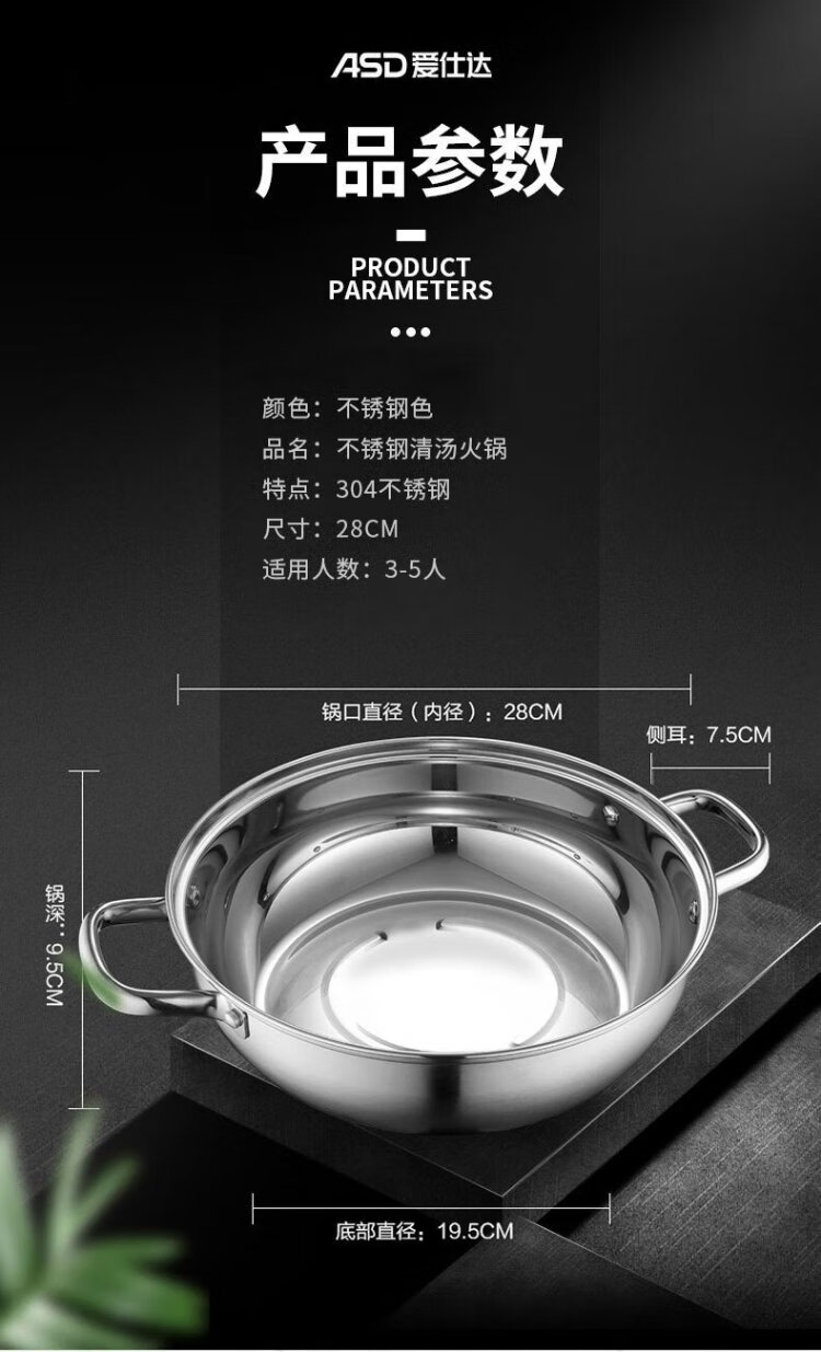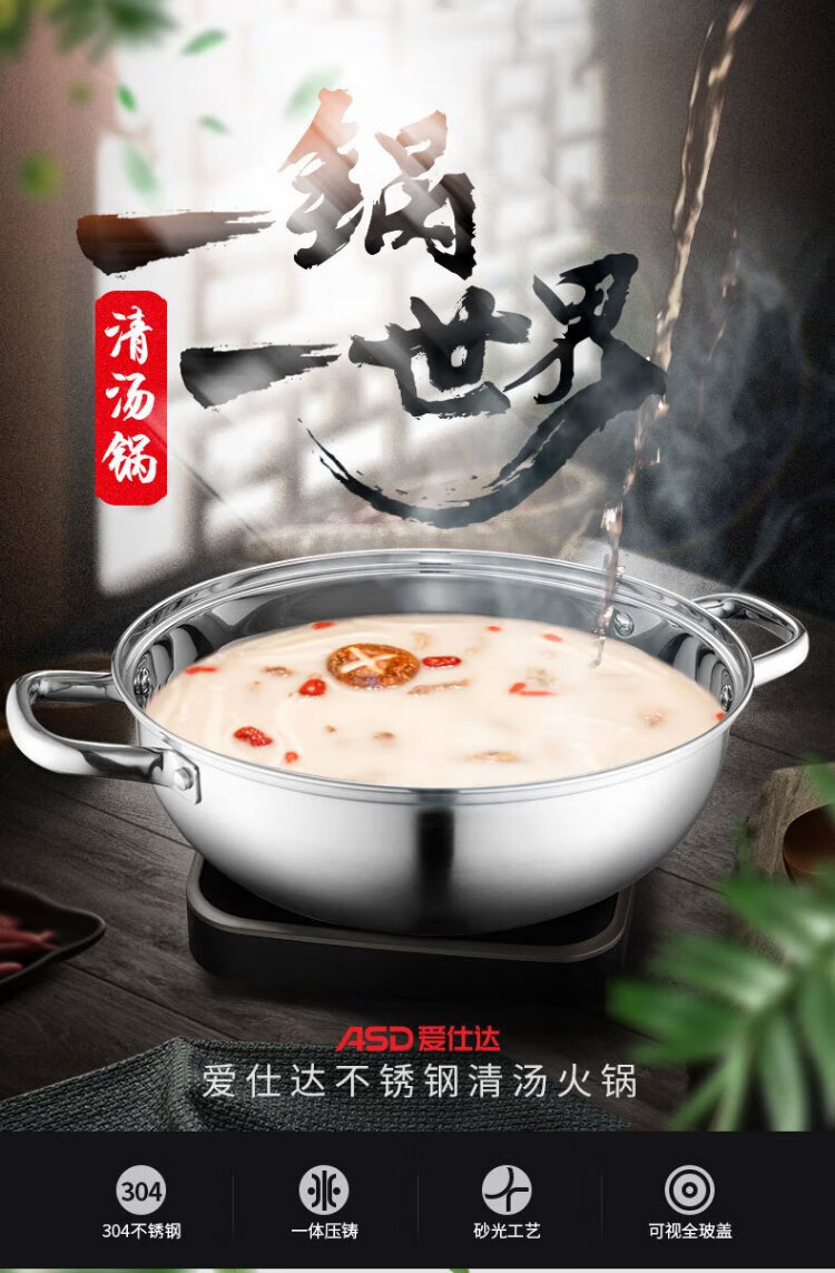 爱仕达 ASD 火锅304不锈钢清汤火锅盆28CM汤锅明火电磁炉通用FS28A6WG