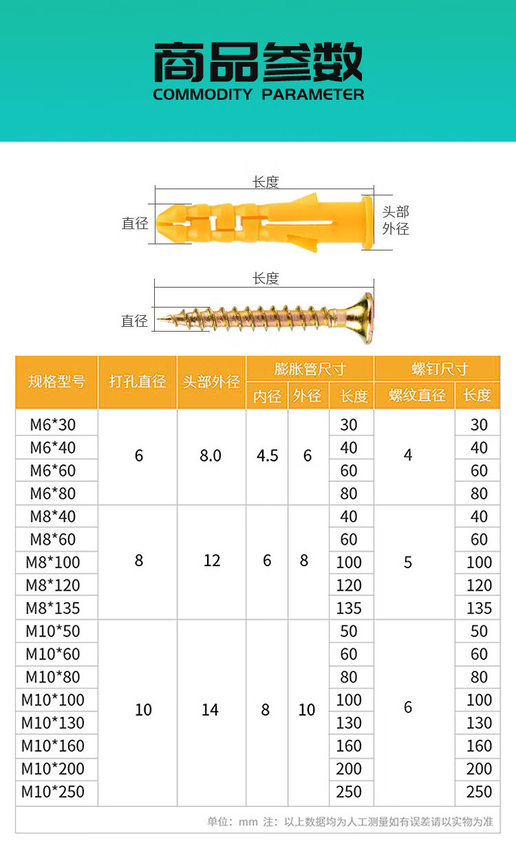 Hasdick Beijing warehouse delivery small yellow croaker plastic expansion tube expansion screw rubber plug bolt expansion plug self-tapping screw set 6*40mm 100 sets