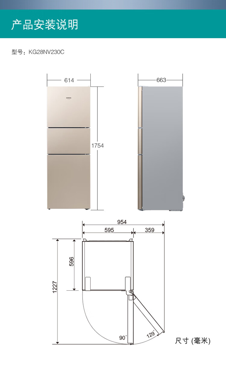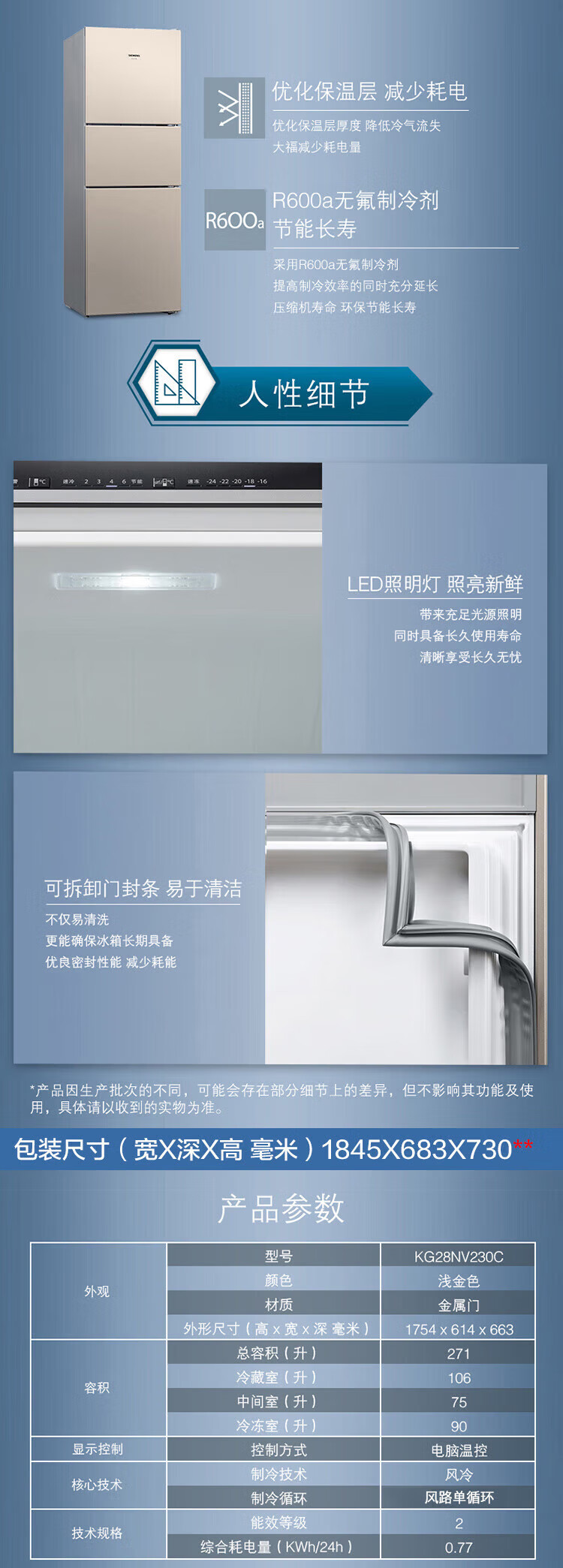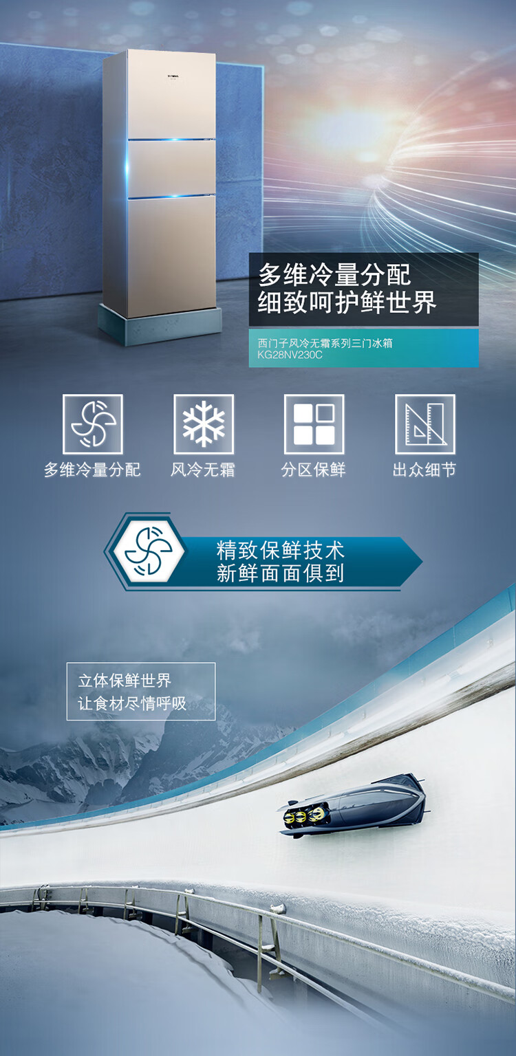 SIEMENS 271 liter air-cooled three-door large-capacity household refrigerator with national subsidies for home appliances three-door double-effect filtration precise temperature control light gold BCD-271W (KG28NV230C)