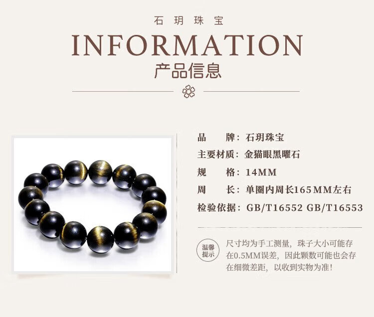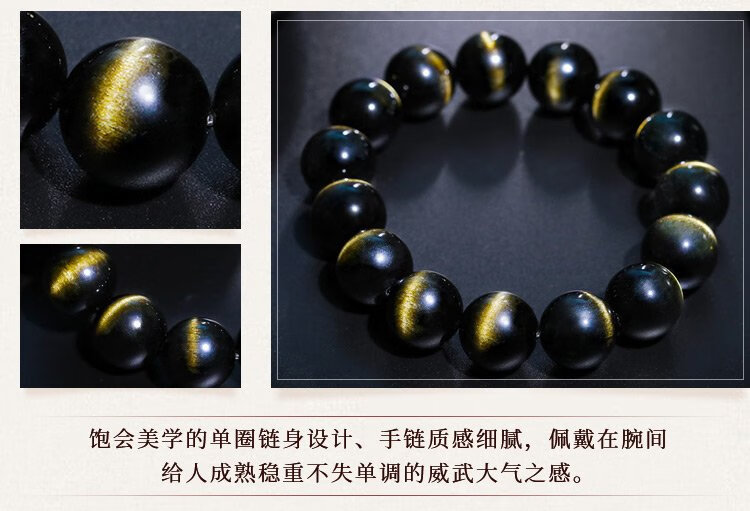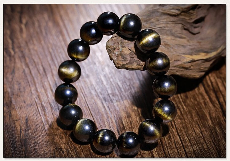 Shi Yue Jewelry Collection Grade 14mm Gold Cat's Eye Natural Obsidian Bracelet Zodiac Year Transport Bead Crystal Bracelet for Men and Women
