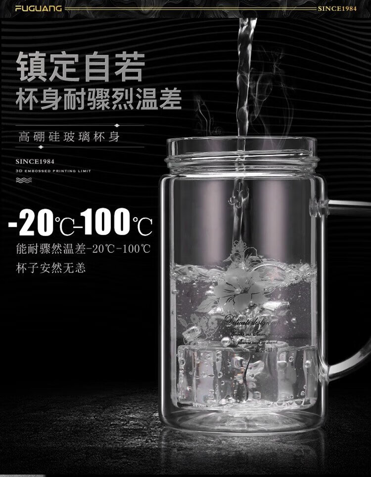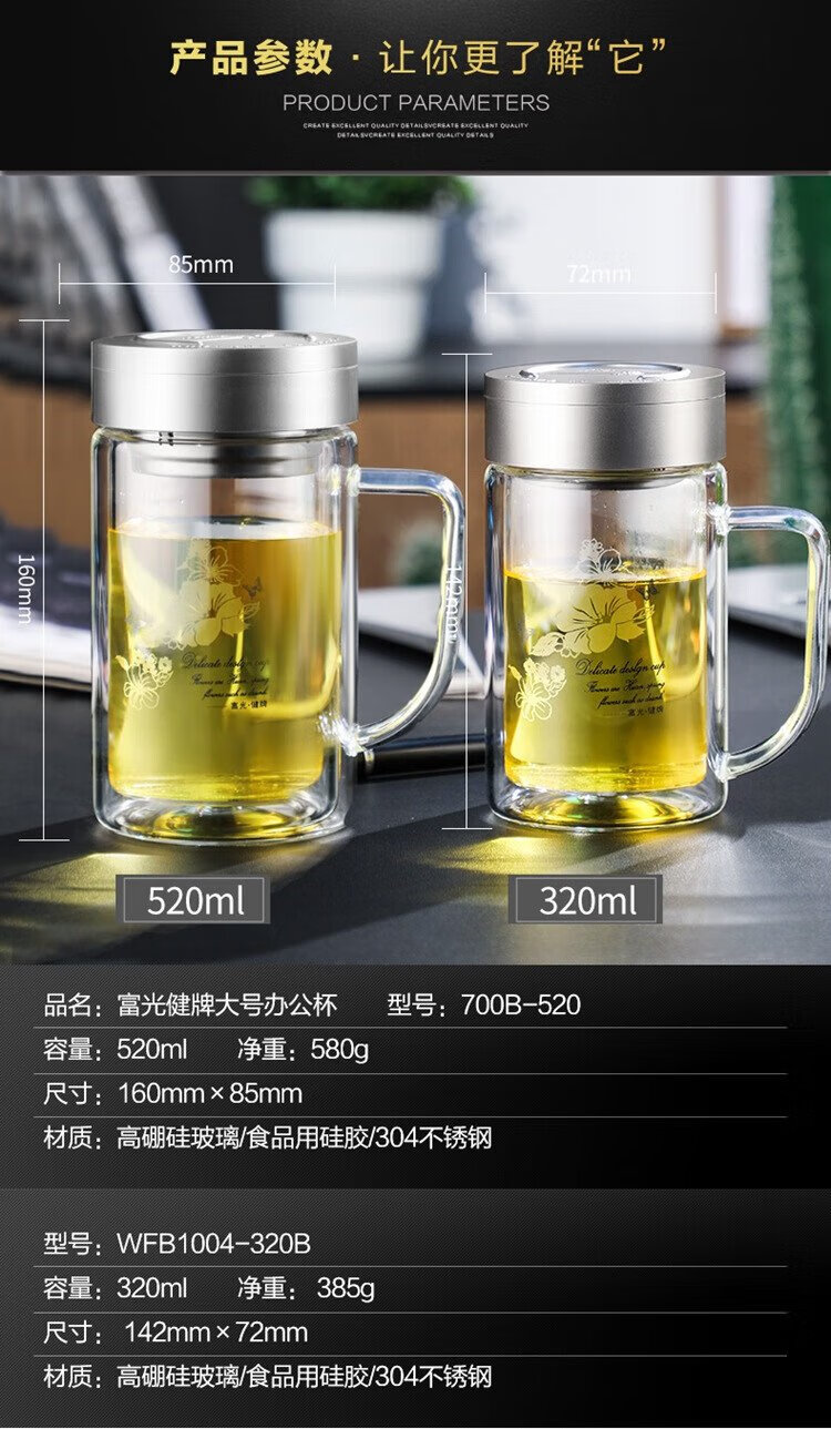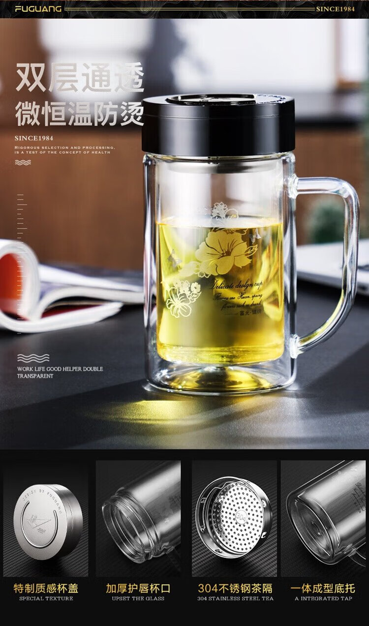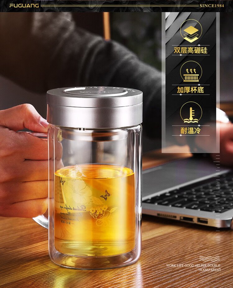 Fuguang double-layer glass business tea cup large capacity heat-resistant office water cup filter with handle silver 320ml