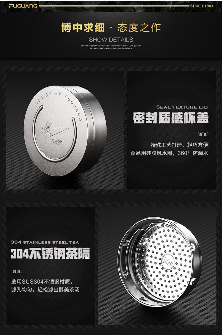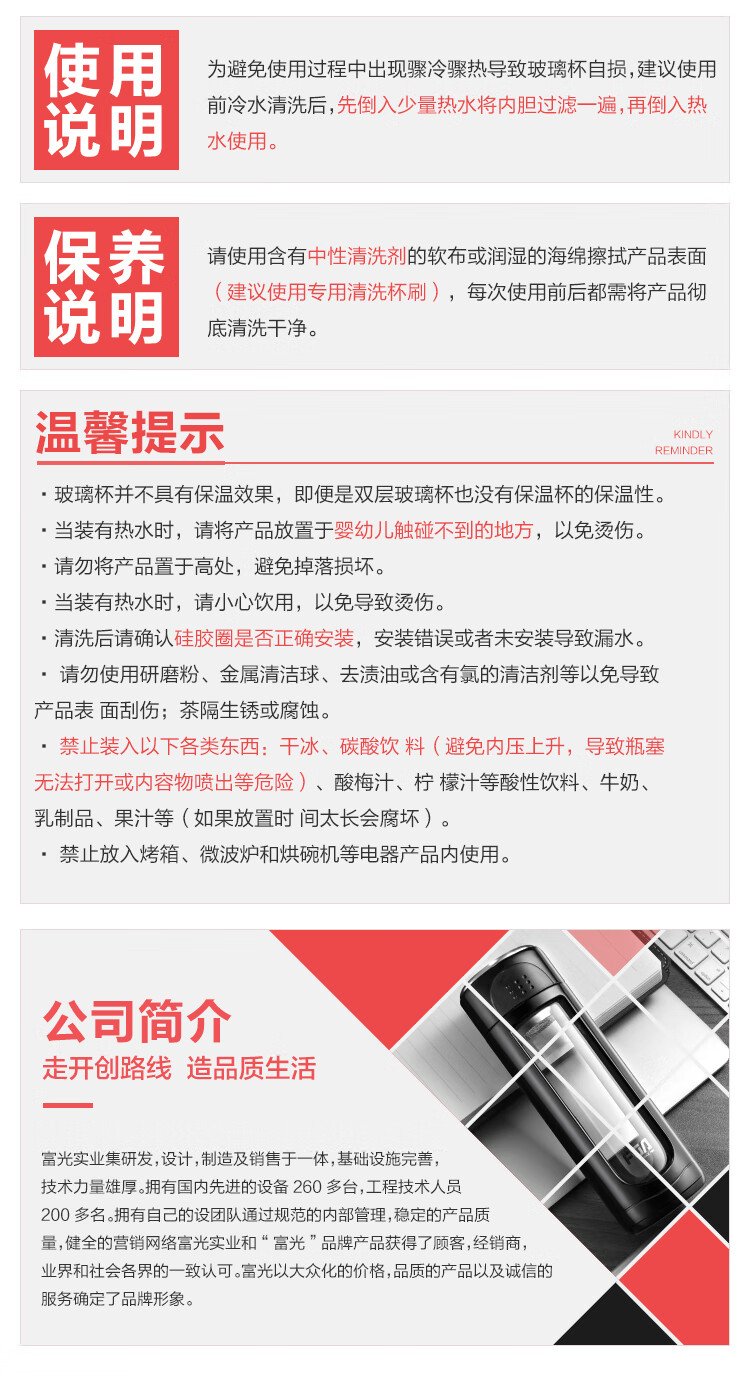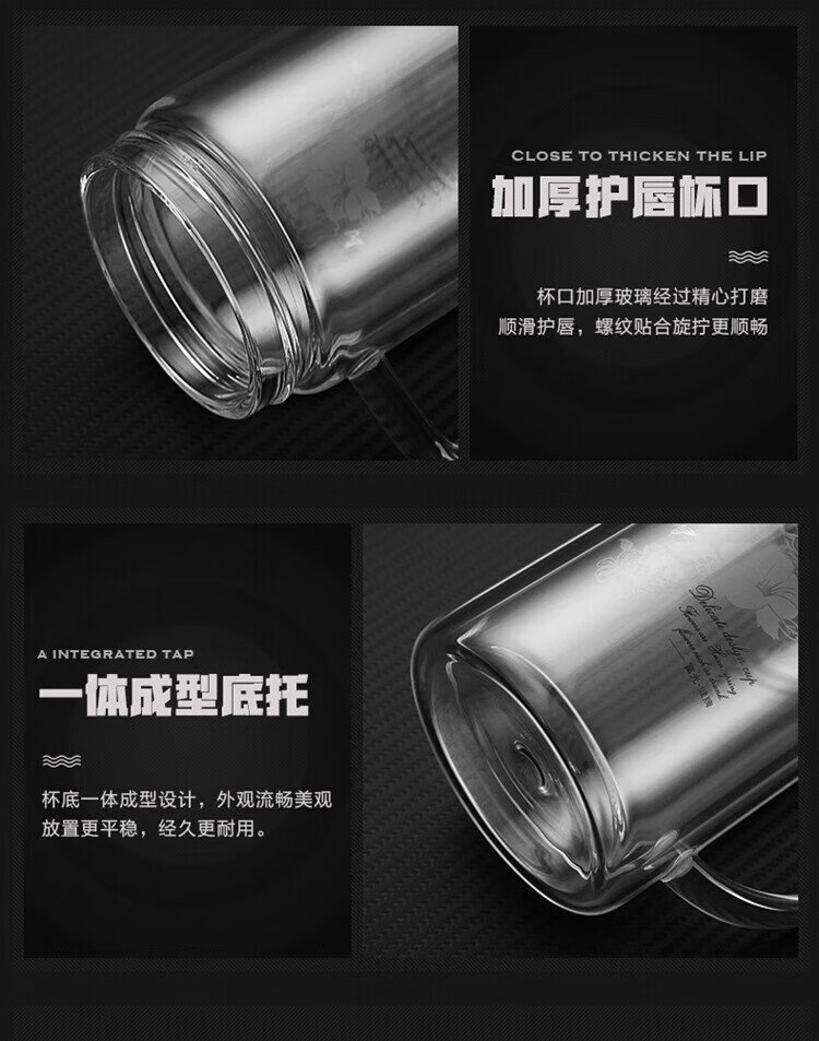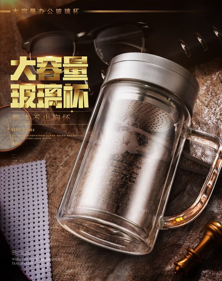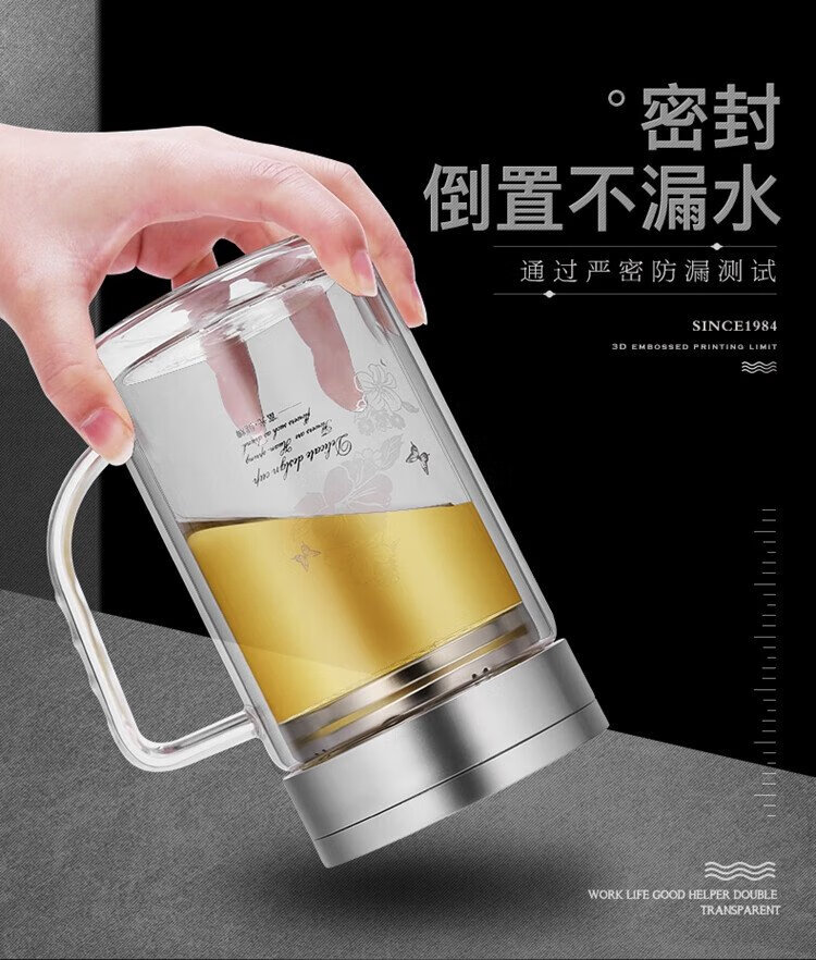 Fuguang double-layer glass business tea cup large capacity heat-resistant office water cup filter with handle silver 320ml