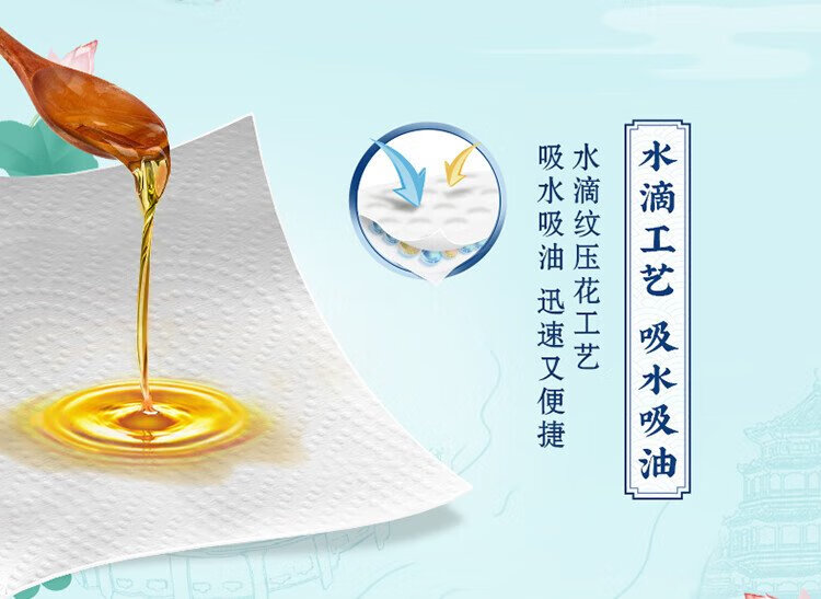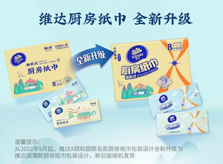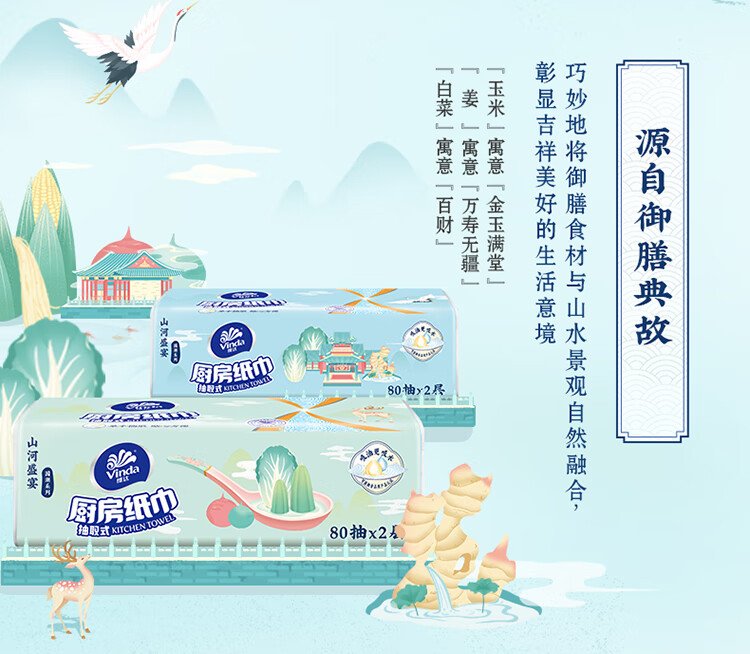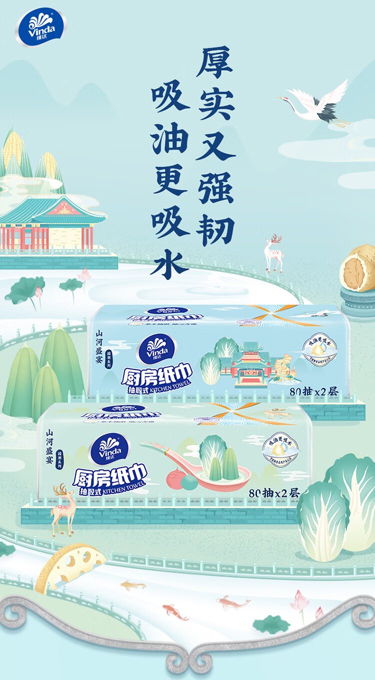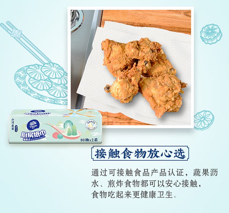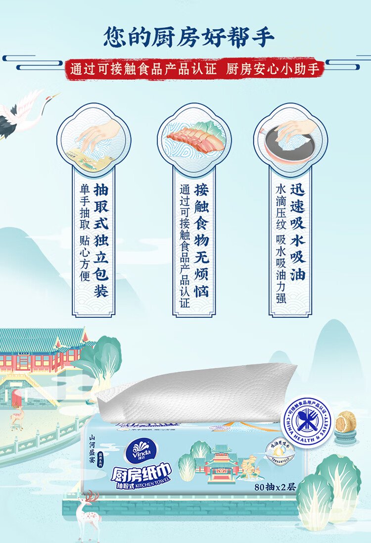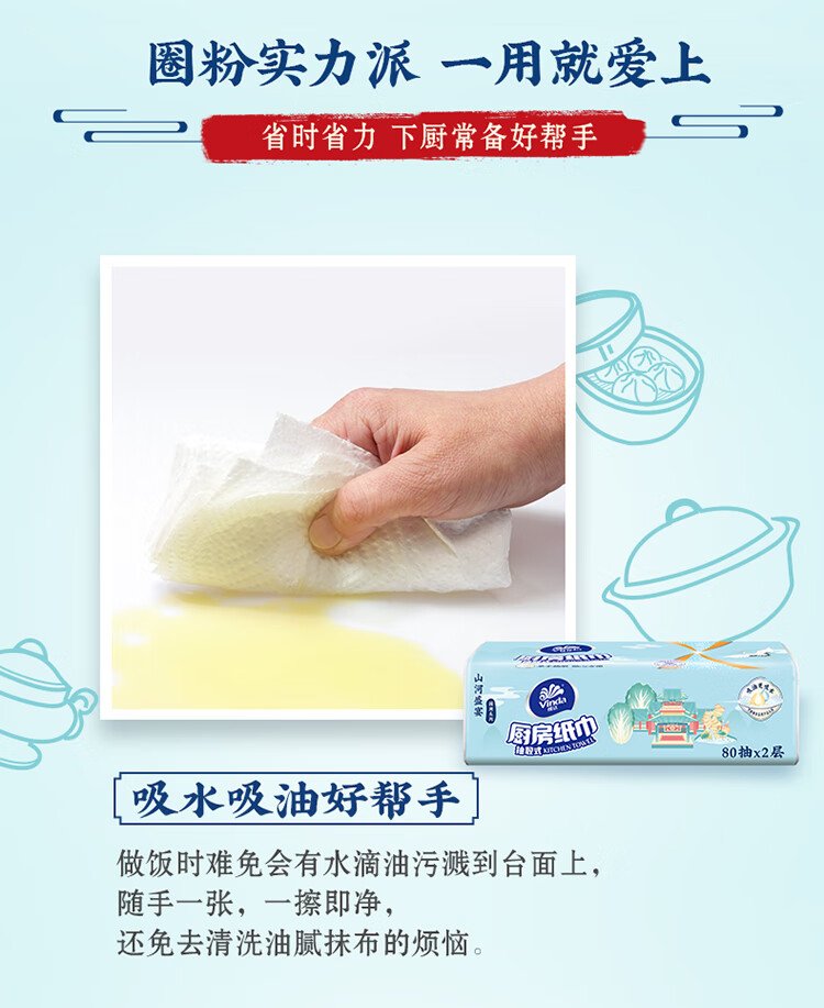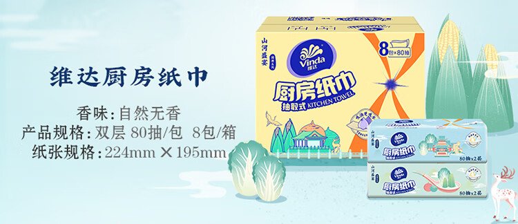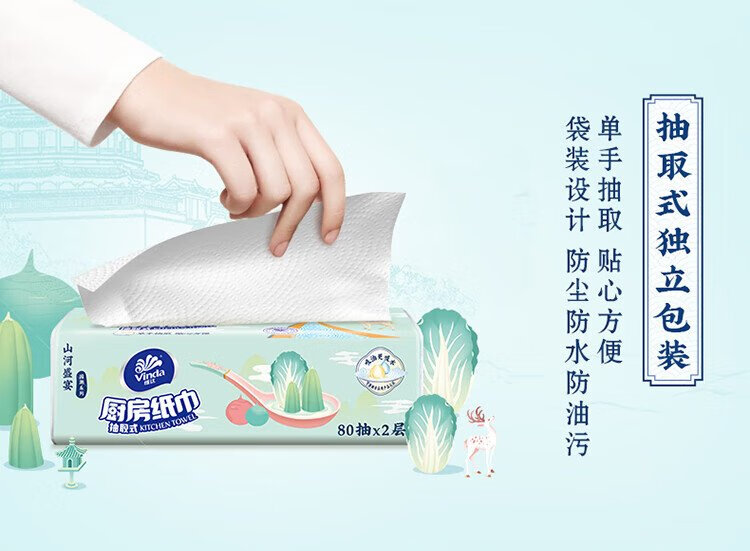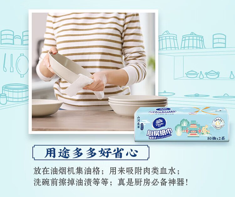 Vinda kitchen paper 80 pieces*8 packs, oil and water absorbent kitchen paper, thick and strong, food contact grade