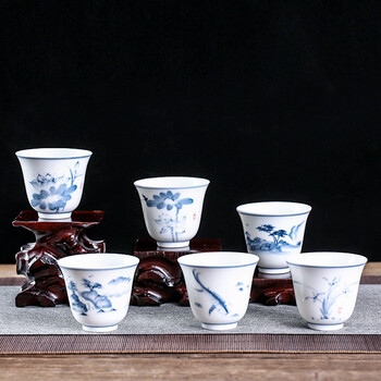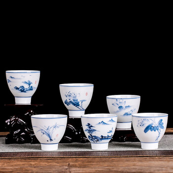 MULTIPOTENT Kung Fu Tea Cup Hand-painted Ceramic Blue and White Landscape Thin Body Porcelain Master Cup 6 Cups with Different Patterns Gift Box