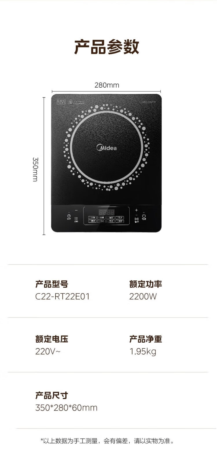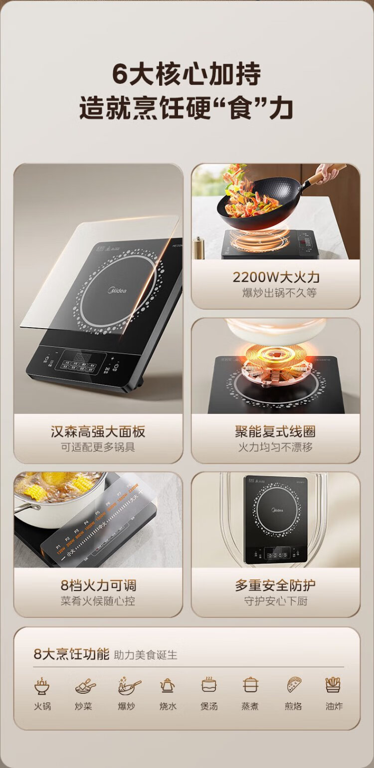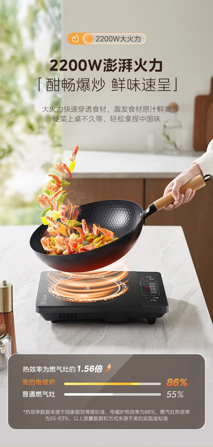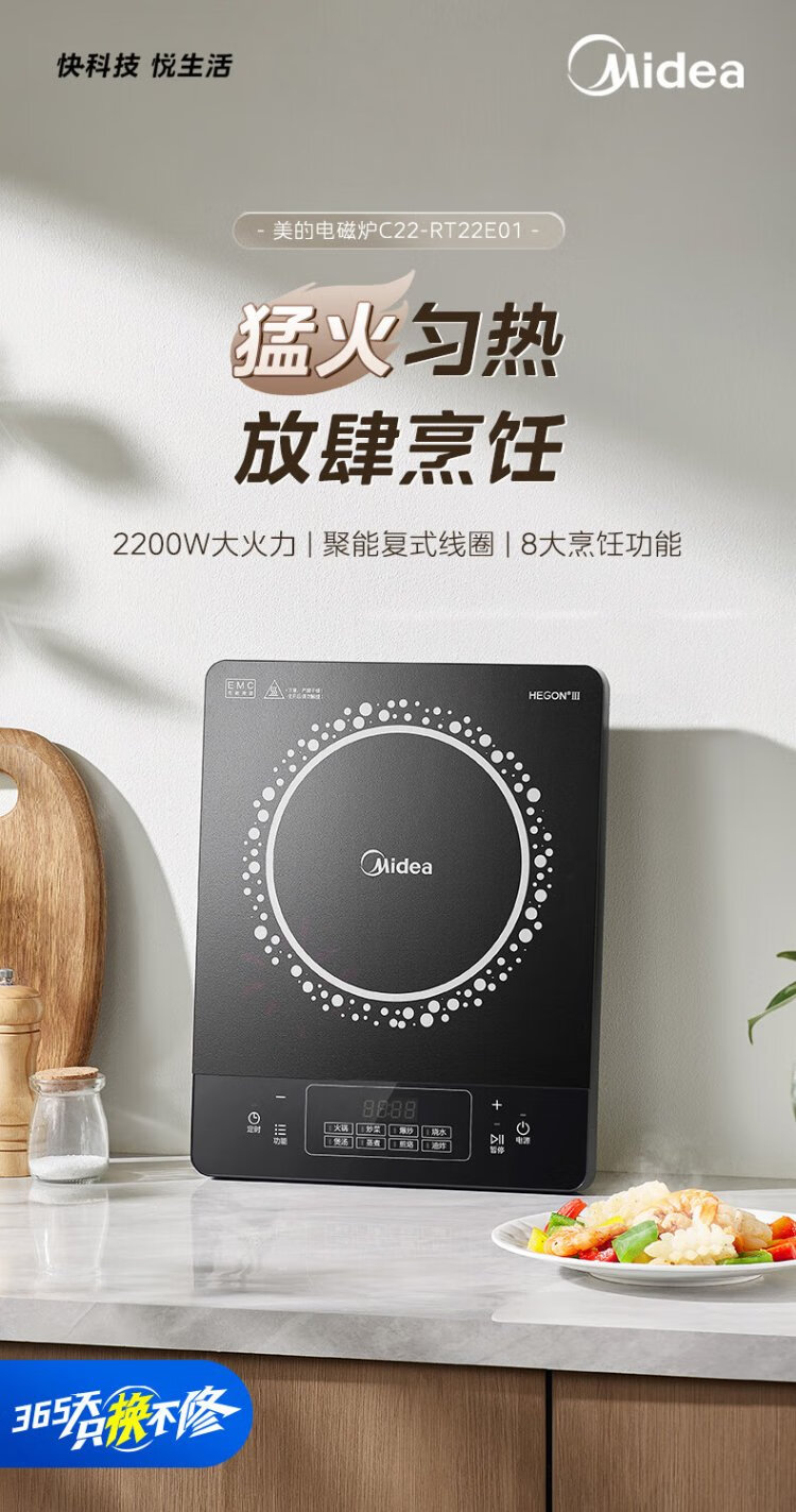 Midea induction cooker electric ceramic stove 2200W high-power household fierce stir-frying durable panel eight-speed firepower slim induction cooker hot pot state subsidy C22-RT22E01