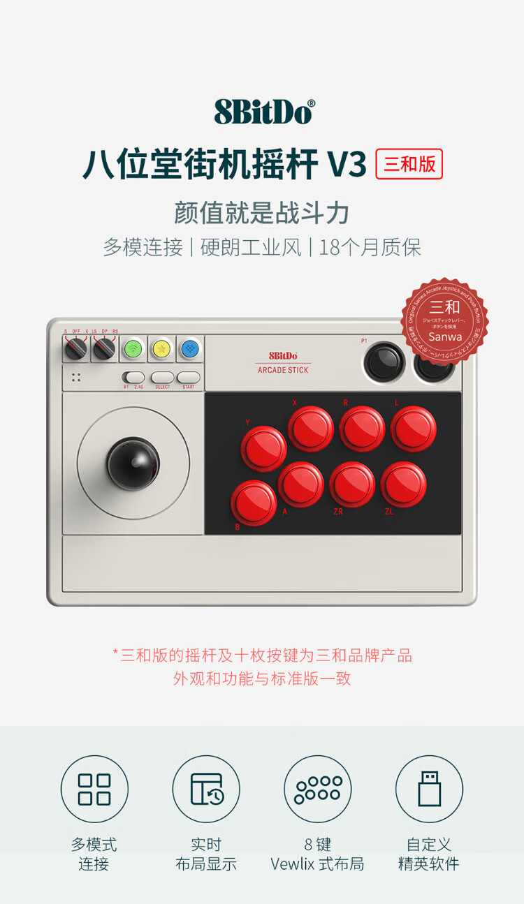8BitDo arcade joystick V3 game joystick Sanwa version Street Fighter 6 multi-mode Switch2 action Fighting 97 Tekken 8 Legend of the Wolf PC computer game console steam e-sports
