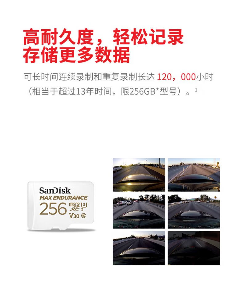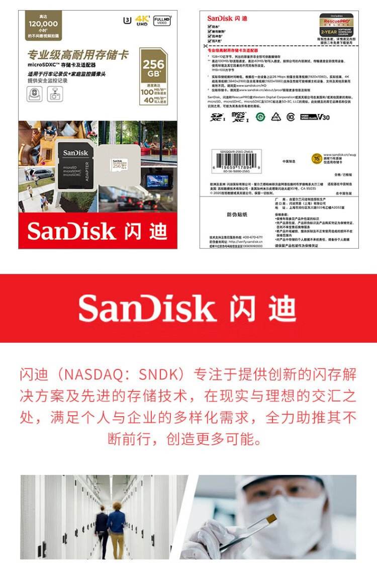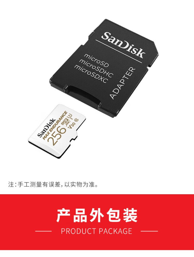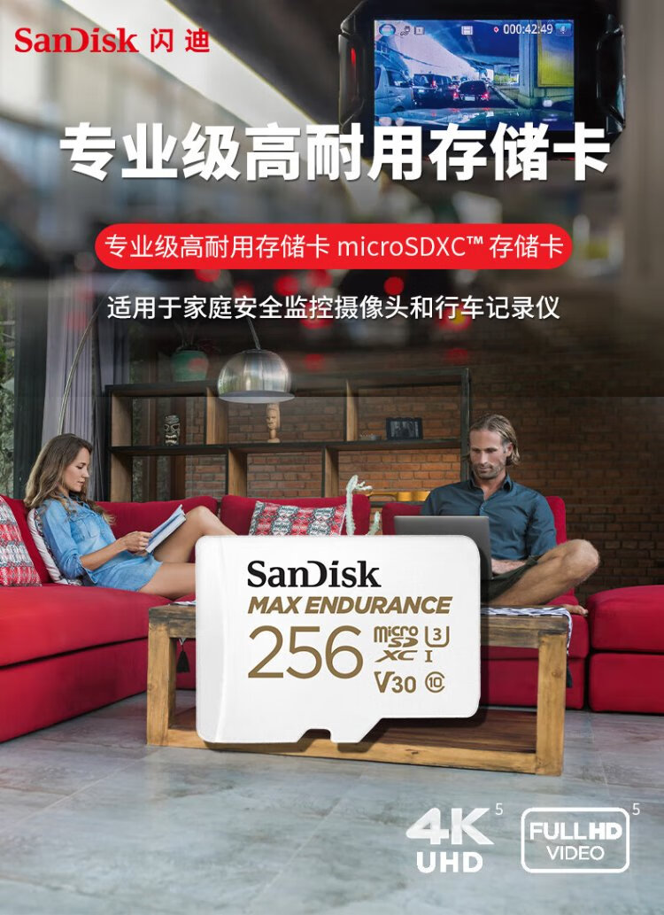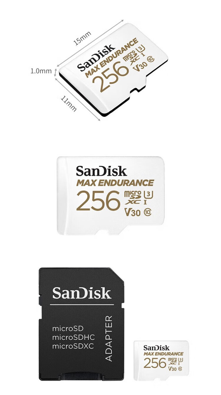 SanDisk 256GB TF (MicroSD) memory card 4K V30 U3 is suitable for home monitoring and driving recorder memory cards. It is durable and has longer recording time.