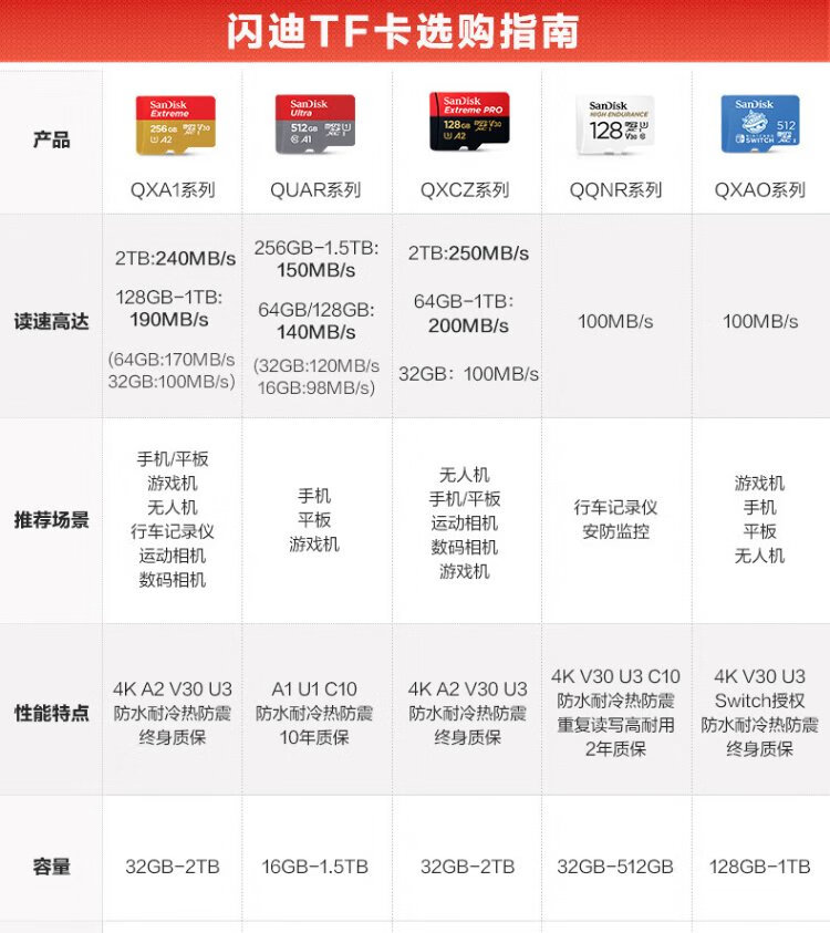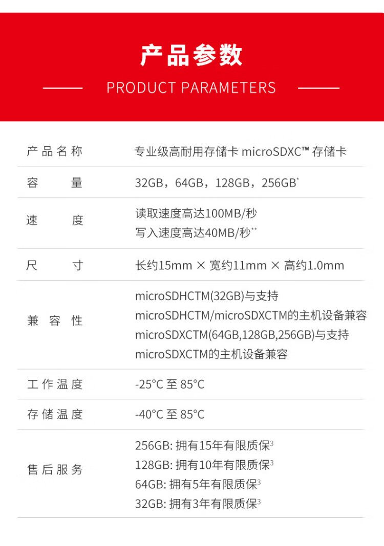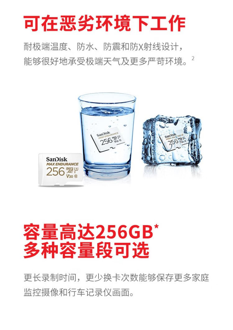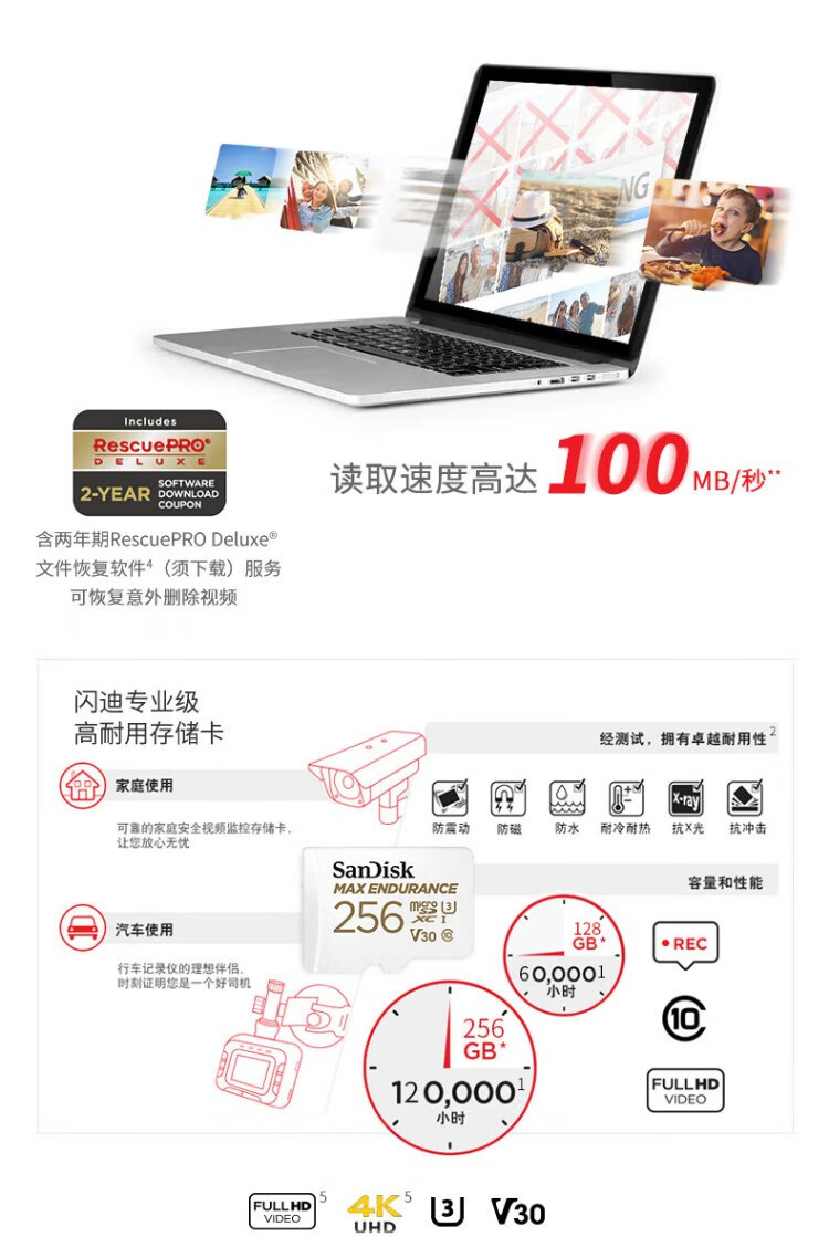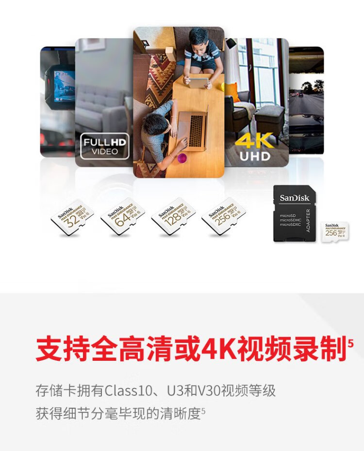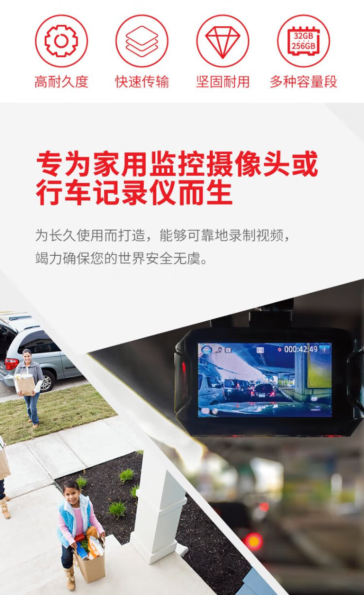 SanDisk 256GB TF (MicroSD) memory card 4K V30 U3 is suitable for home monitoring and driving recorder memory cards. It is durable and has longer recording time.