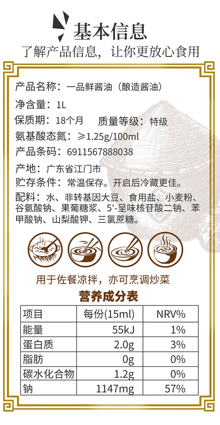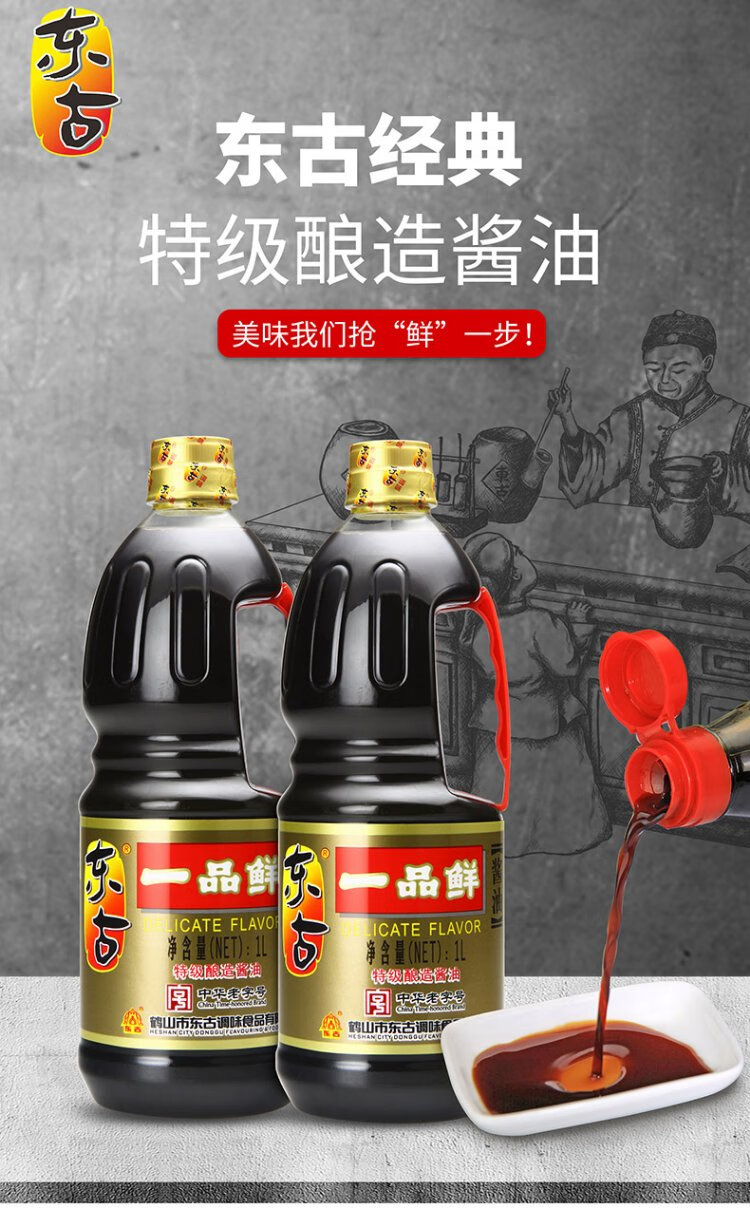 Donggu Yipinxian soy sauce, premium light soy sauce, 1L*2 bottles, 0-fat seasoning for dipping into cold dishes for stir-fry
