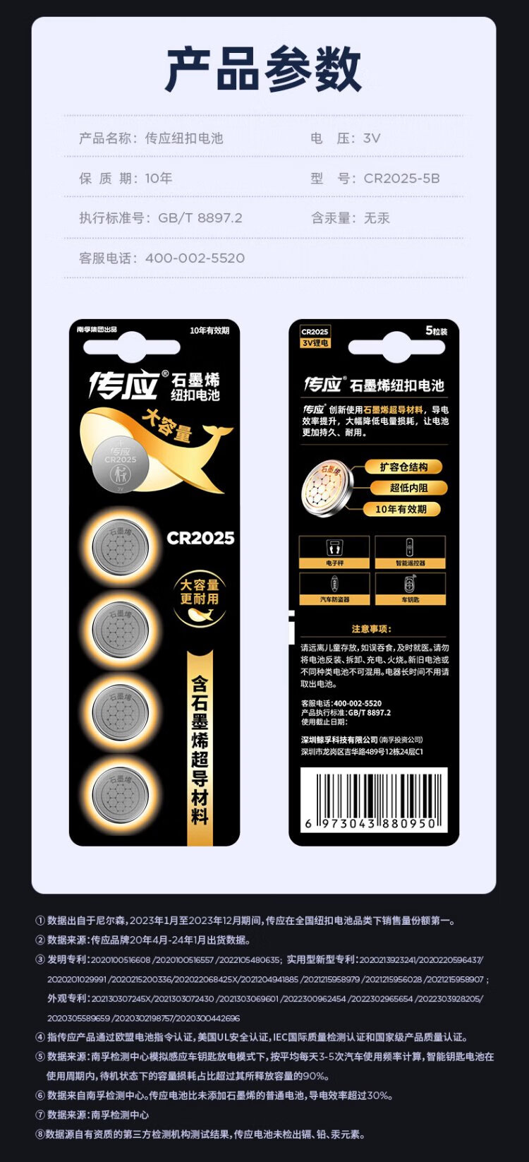 Chuanying Nanfu graphene CR2025 button battery 5 pieces 3V lithium battery suitable for Volkswagen Mercedes-Benz BYD and other car keys remote control blood glucose meter ear thermometer etc. cr2025