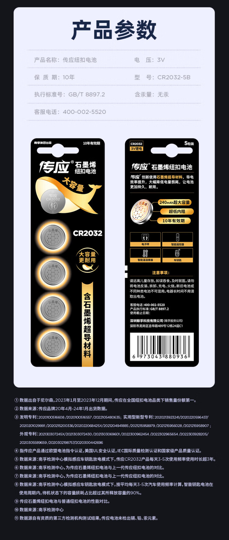 Chuanying Nanfu graphene CR2032 button battery 5 pieces 3V lithium battery suitable for Volkswagen, Audi, BMW and other car key remote controls Xiaomi box ear thermometer and other cr2032