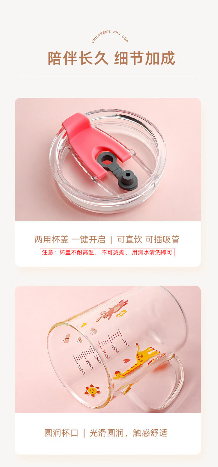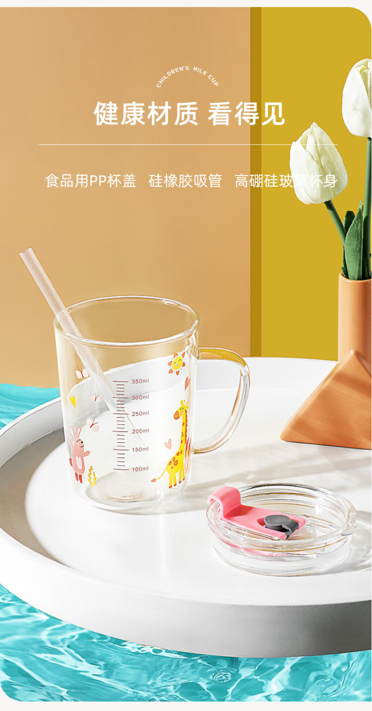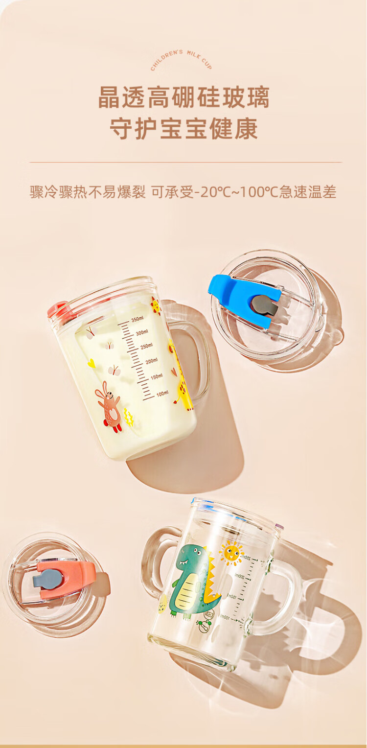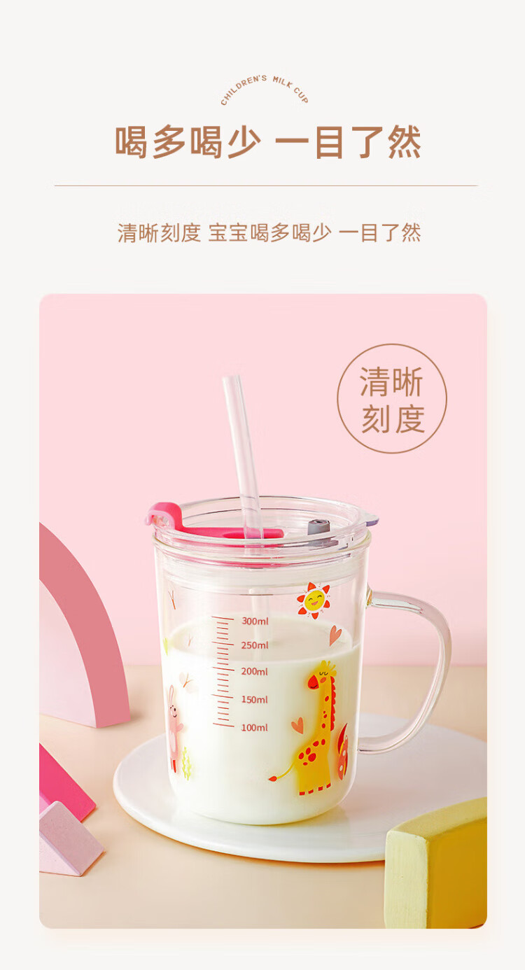 Fuguang glass household children's milk cup with graduated straw water cup male and female baby milk powder cup with handle