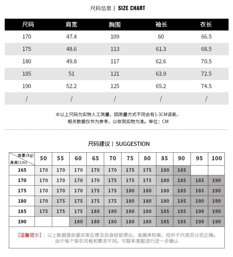 China (cm) 165 / 88-90 170 / 96-98 175 / 108-110 180 / 118-122 185 / 126-130