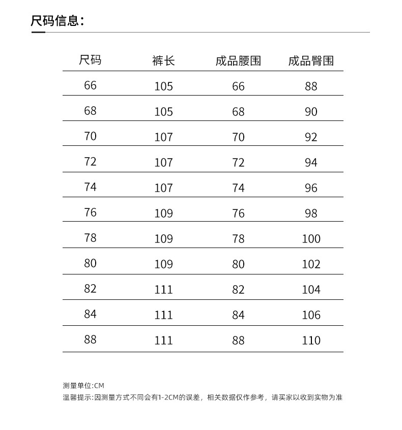 Outseam (cm) 99 cm 101.5 cm 104 cm 106.5 cm 109 cm