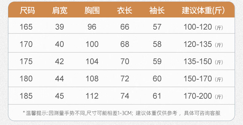 China (cm) 165 / 88-90 170 / 96-98 175 / 108-110 180 / 118-122 185 / 126-130