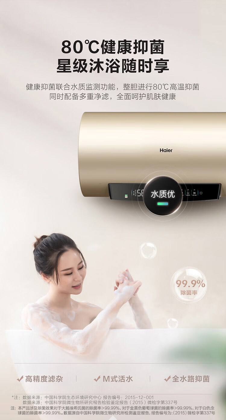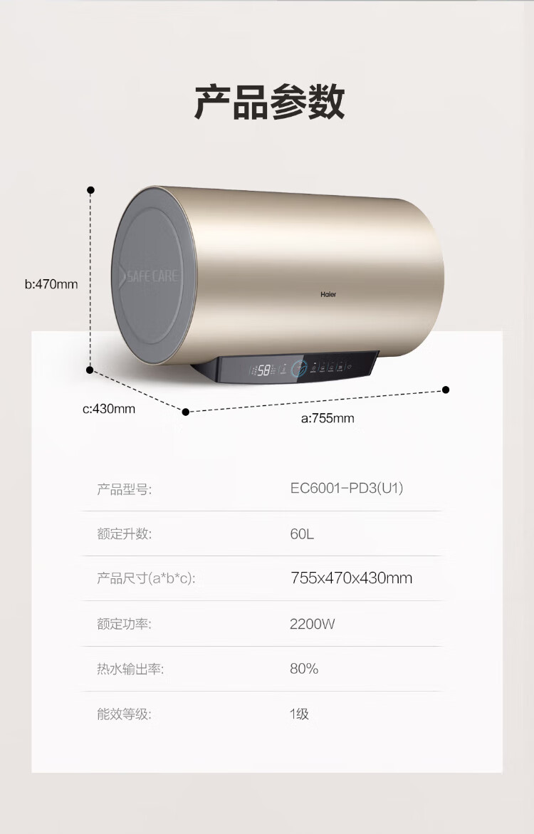 Haier (Haier) national subsidy 20% electric water heater 60 liters PD3 King Kong seamless bladder lifetime no need to replace magnesium rod first level energy efficiency energy saving water storage type large water volume household OCC