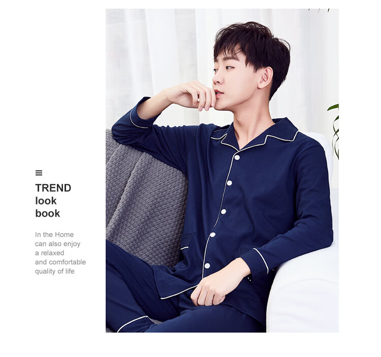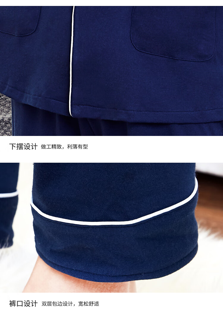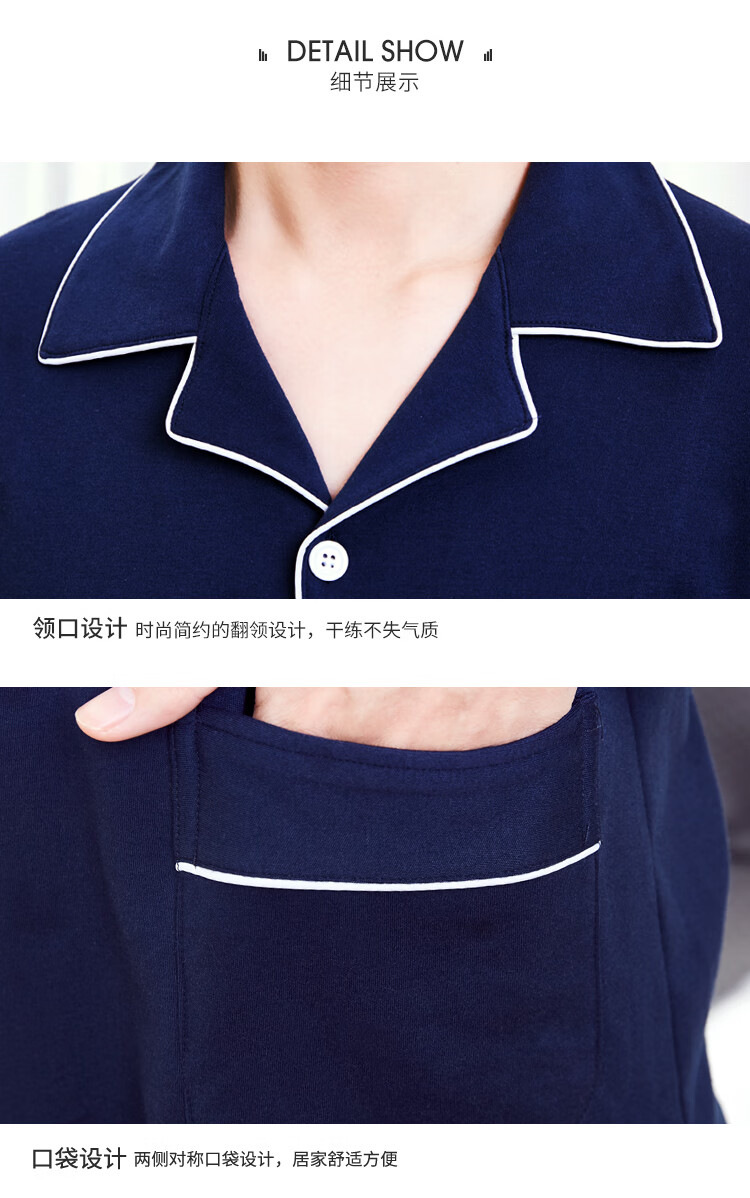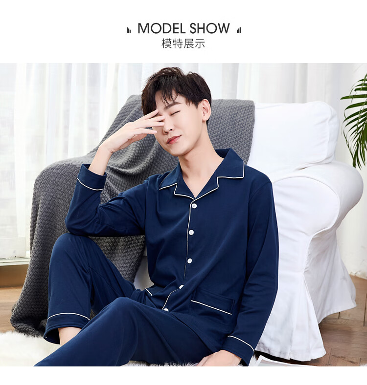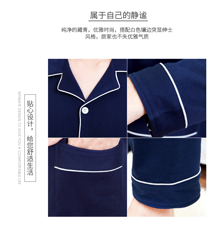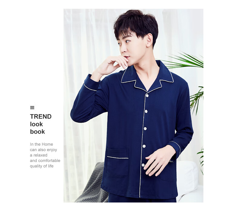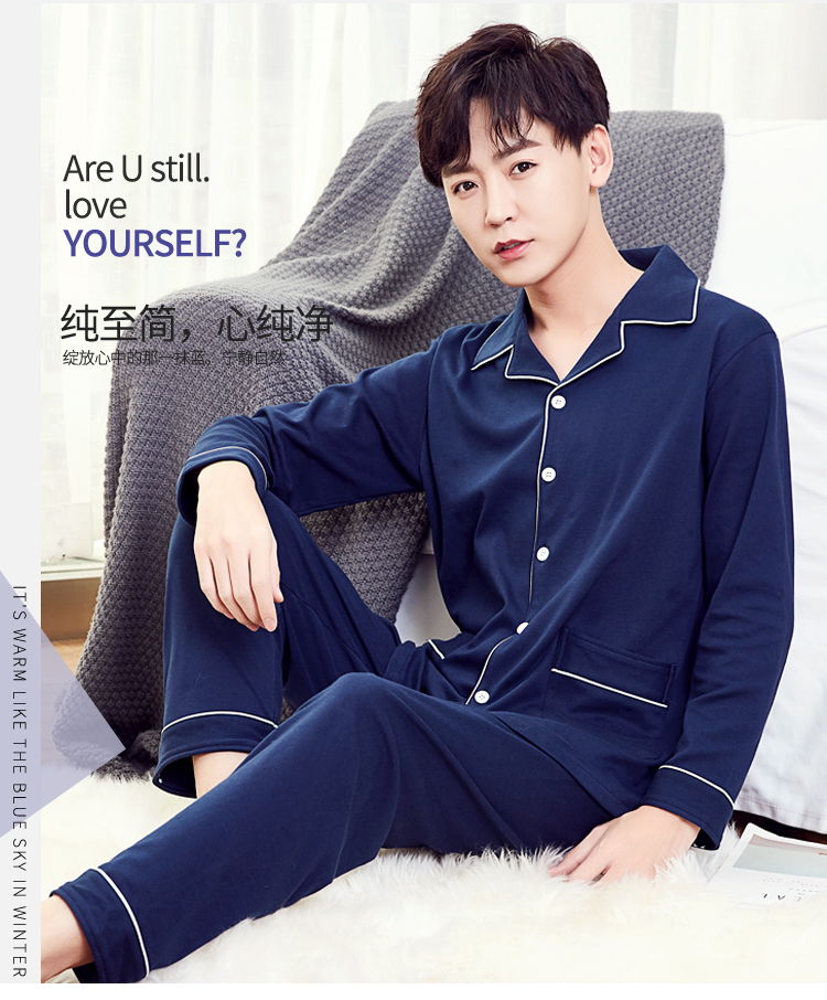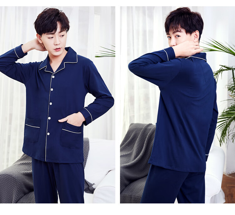 Silk Manshi pajamas for men, long-sleeved cotton spring and autumn solid color simple loose men's pajamas can be worn outside cardigan casual home wear set men's classic navy blue (clothes + pants) XXL