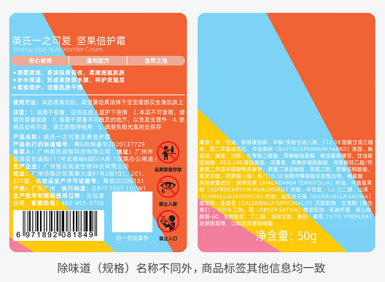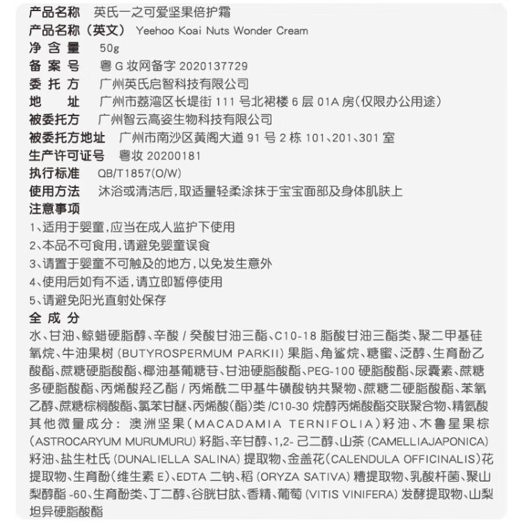 Ying's children's face cream baby face cream nut cream baby skin care face cream newborn moisturizing moisturizing lotion 50g 2 bottles