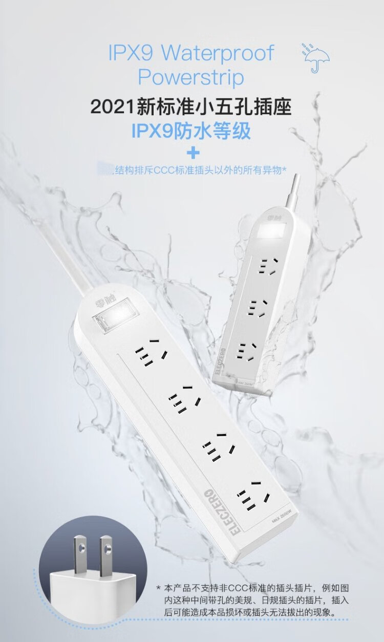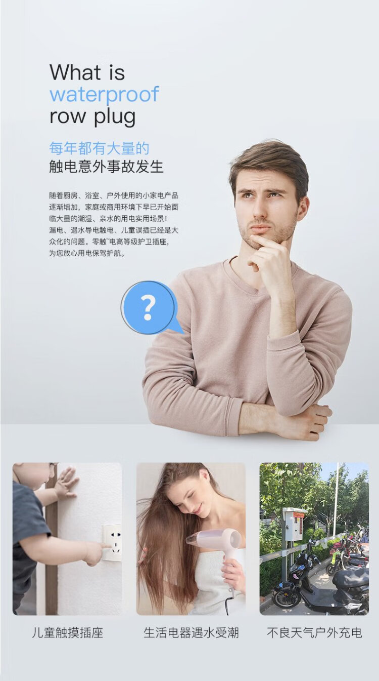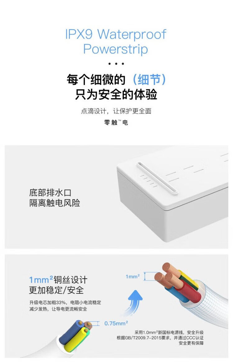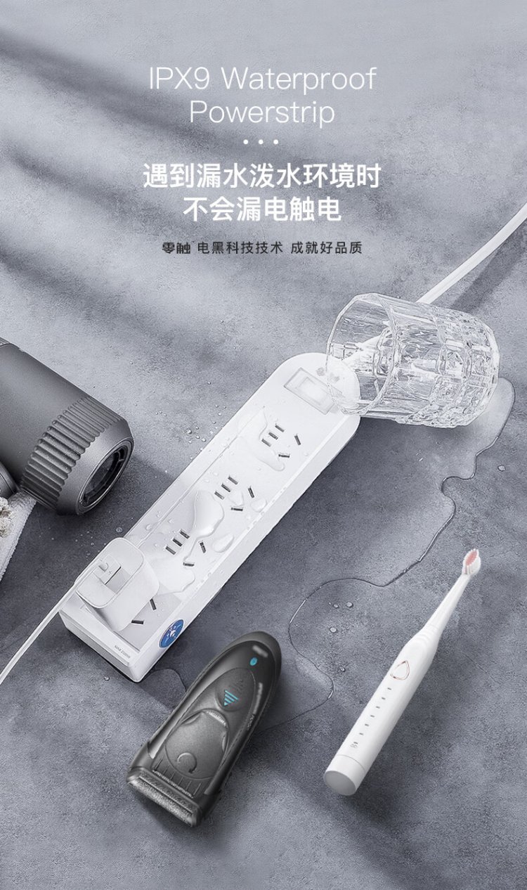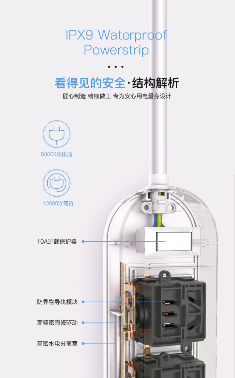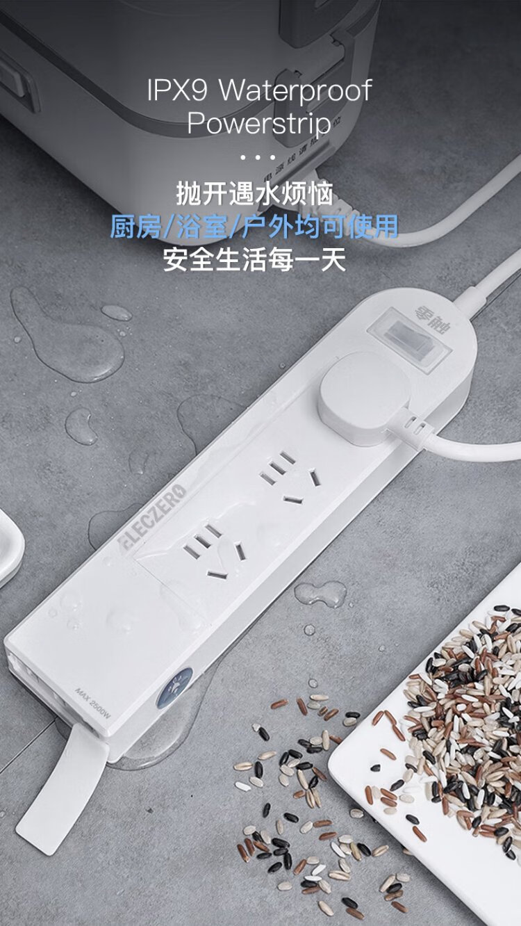 KPQ zero-touch KPQ non-electric shock socket IPX9 level waterproof overload short circuit protection plug strip outdoor rainproof plug strip kitchen bathroom moisture-proof children's anti-electric shock DF02 total length 1.6 meters