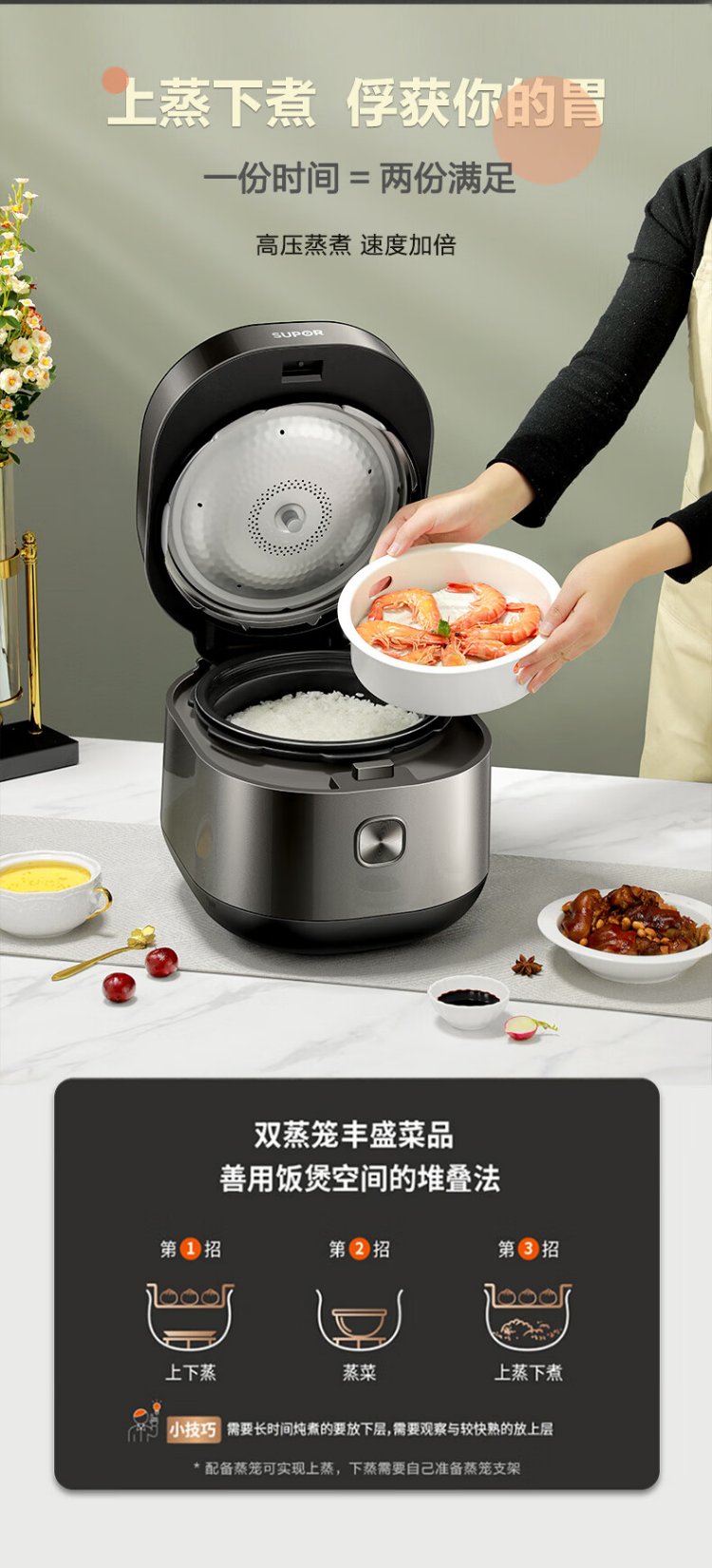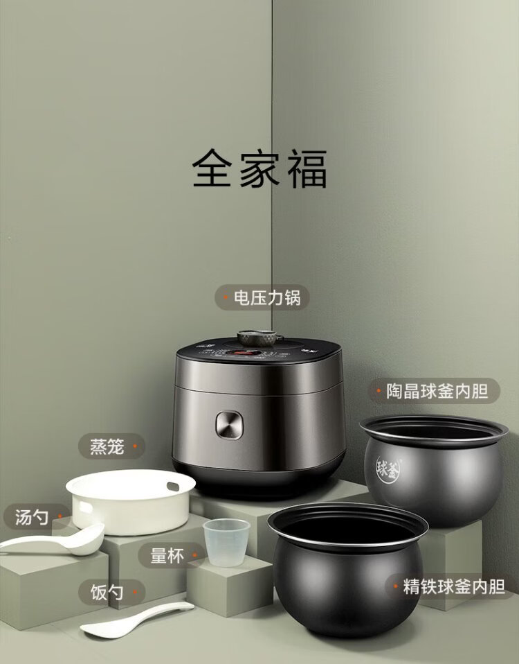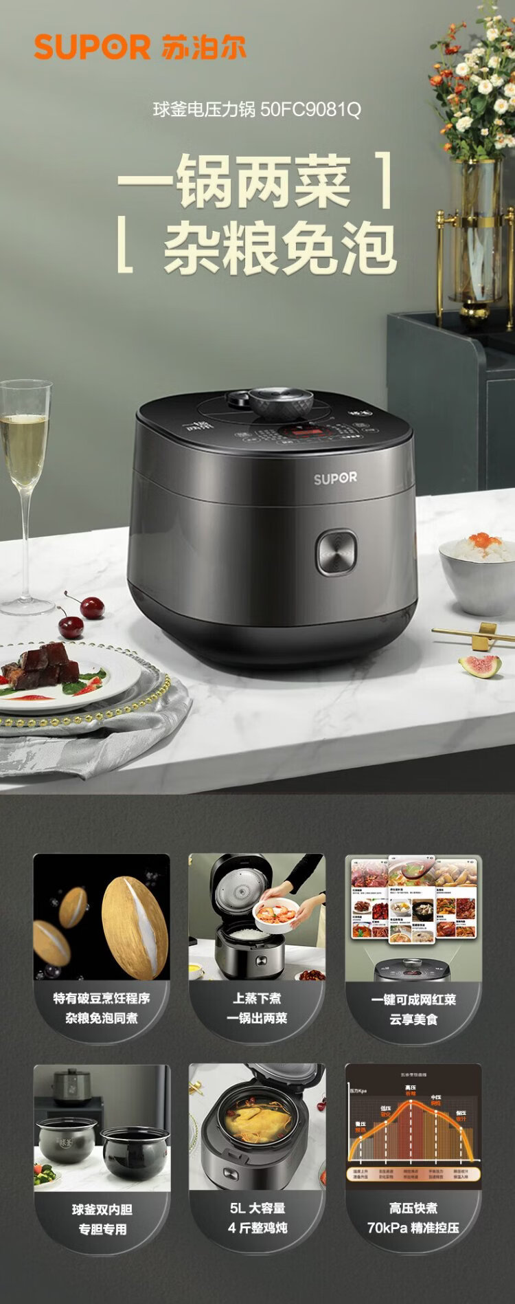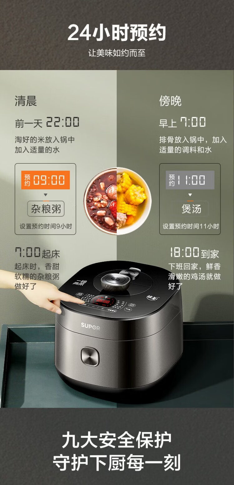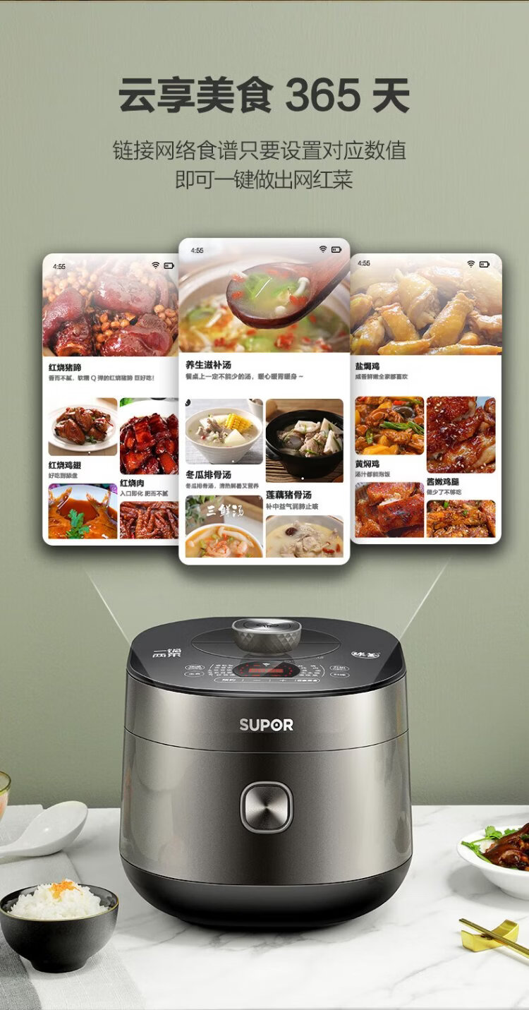 SUPOR fully automatic intelligent reservation electric pressure cooker 5L household steamer upper steaming lower boiling ball kettle double bladder 50FC9081Q rice cooker pressure cooker 4-6 people
