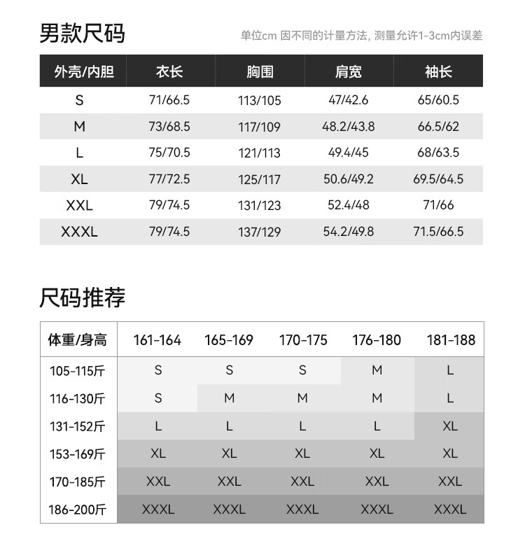 China (cm) 165 / 88-90 170 / 96-98 175 / 108-110 180 / 118-122 185 / 126-130