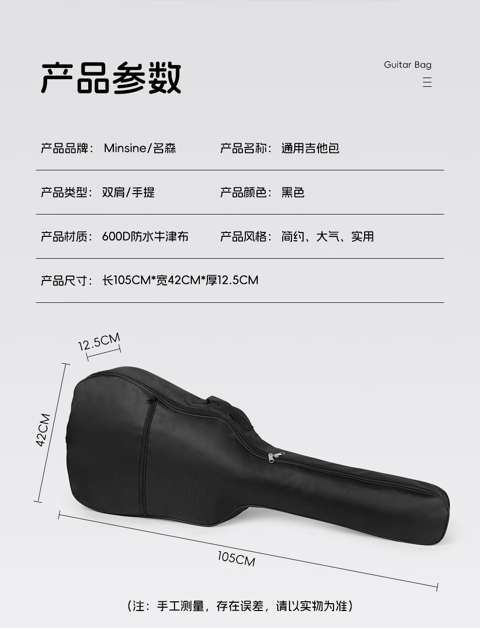 Minsine Colorful Guitar Bag Shoulder Folk Acoustic Guitar Bag Cotton Thickened 41-inch Waterproof and Dustproof Backpack Classic Black