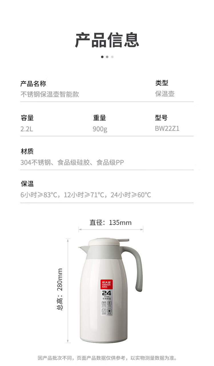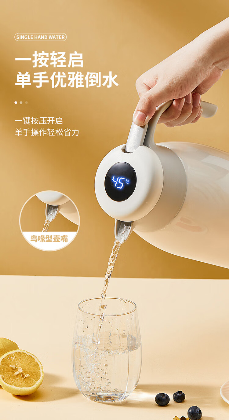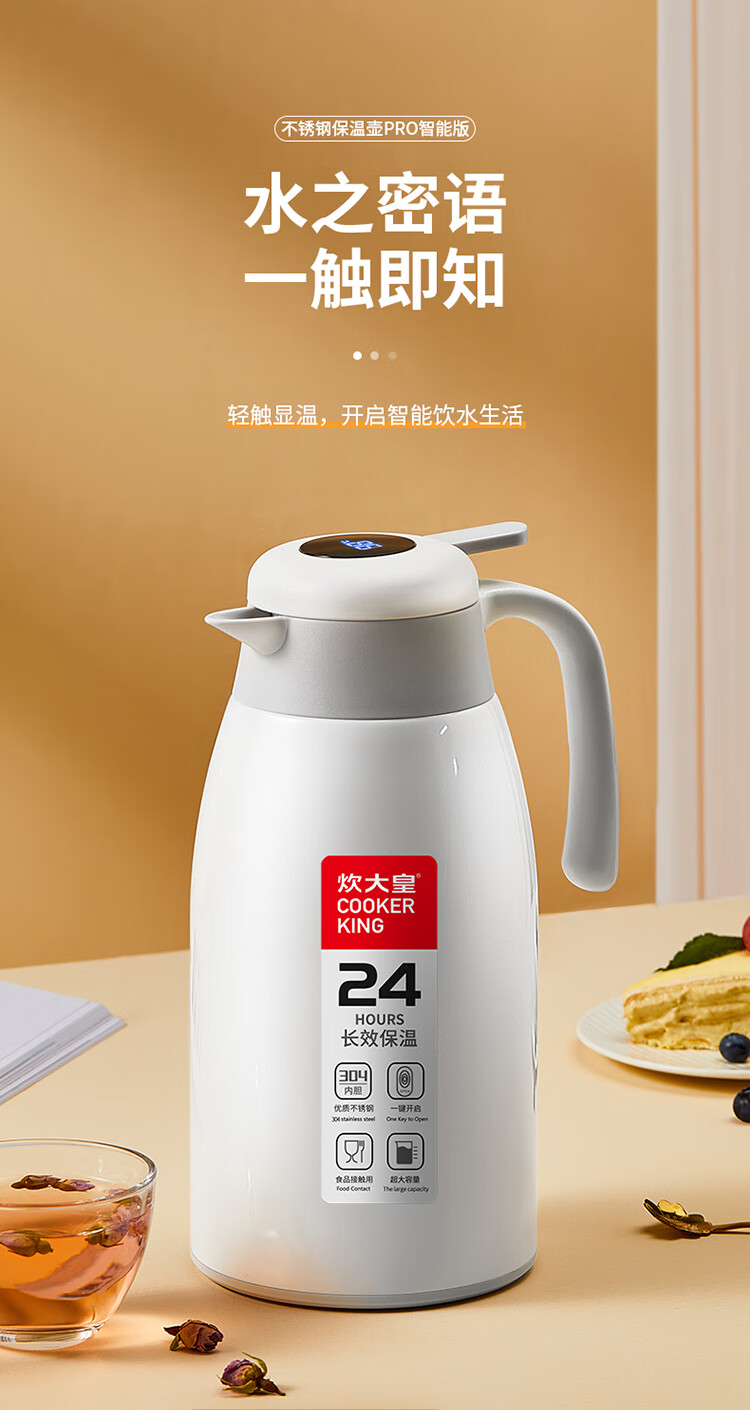 Cuidahuang 304 stainless steel household large capacity non-slip bottom intelligent temperature display thermos kettle elegant white 2.2L