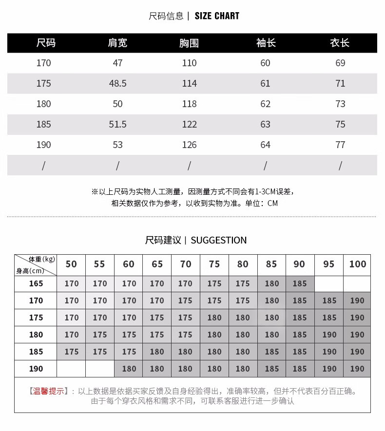 China (cm) 165 / 88-90 170 / 96-98 175 / 108-110 180 / 118-122 185 / 126-130