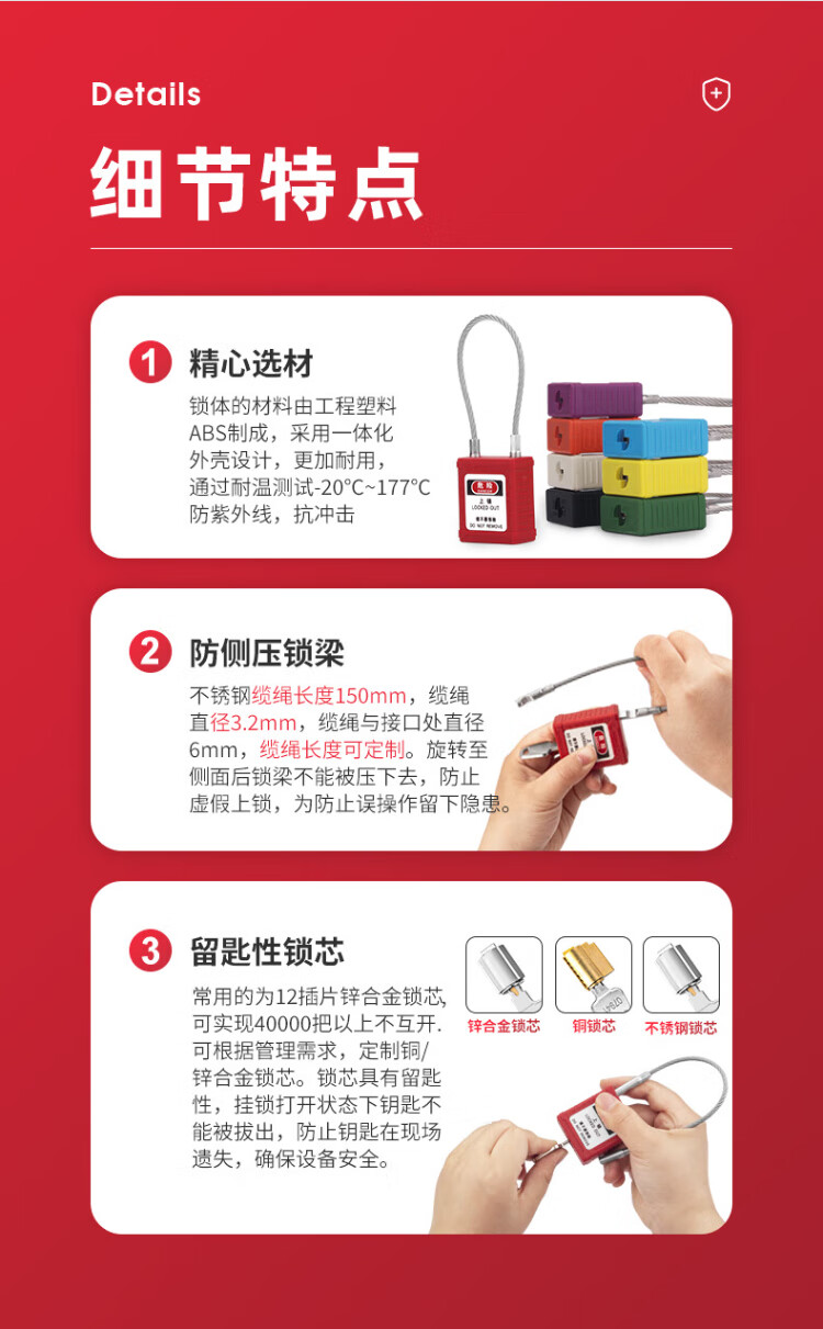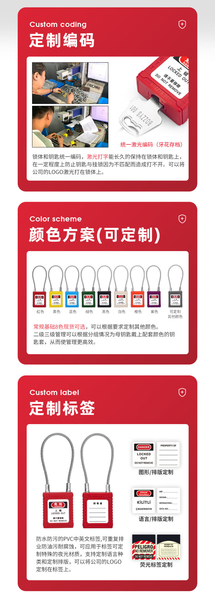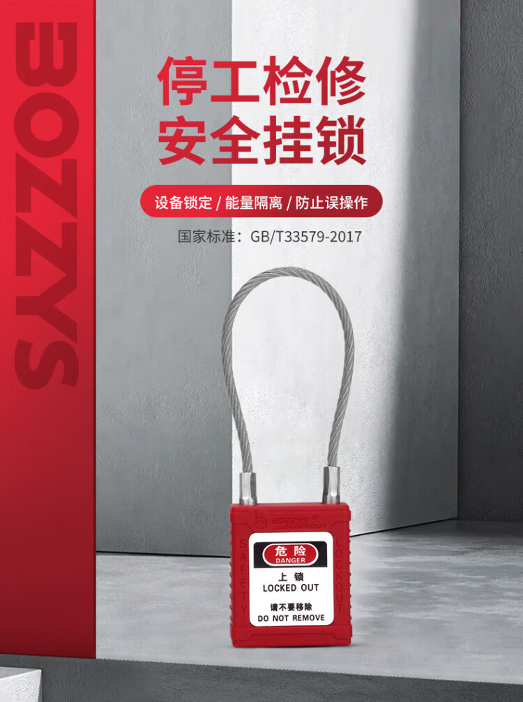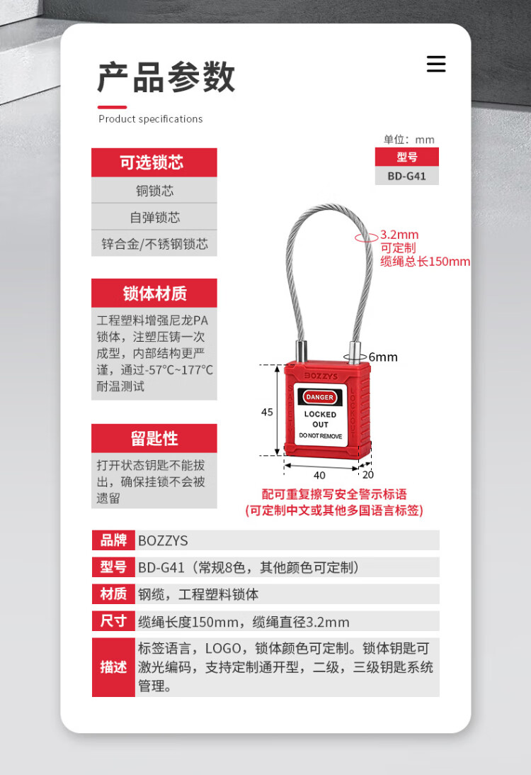 BOZZYS engineering padlock cannot open 2 keys stainless steel cable 150*3.2MM safety lock head diameter 6mm energy isolation industrial cable safety lock BD-G41KD