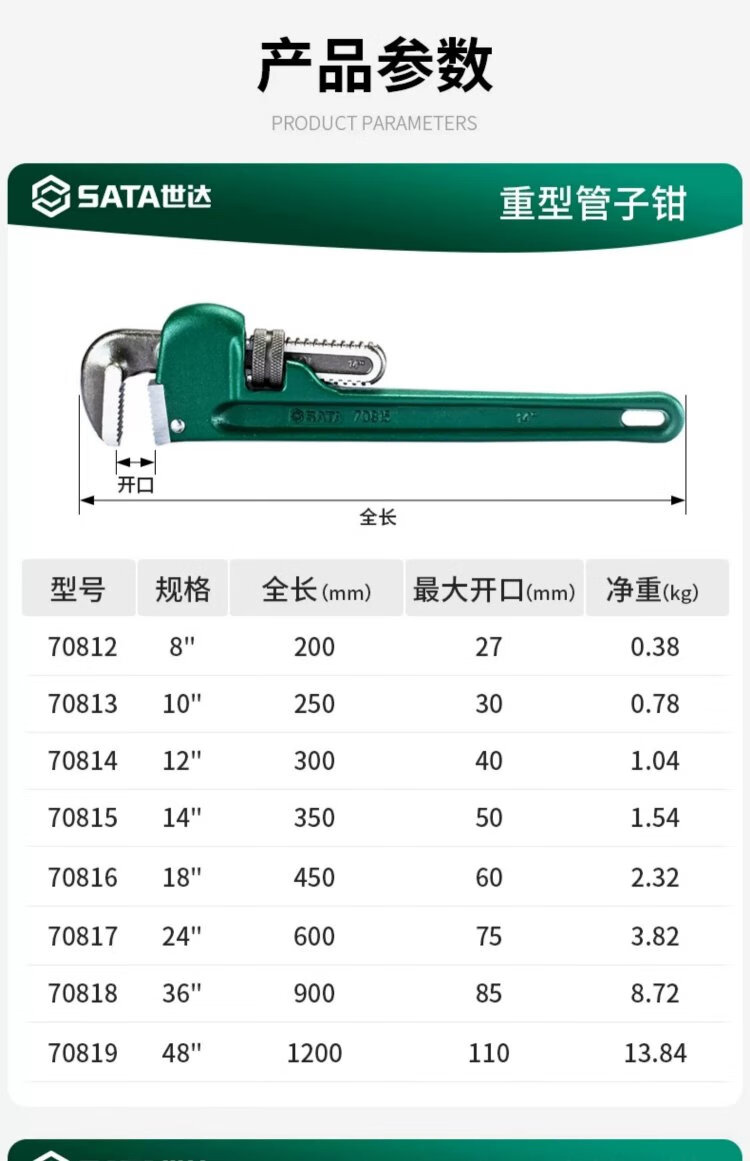 SATA heavy-duty pipe wrench 10 large opening water pipe wrench multi-function self-tightening throat pliers heavy-duty pipe wrench 70813