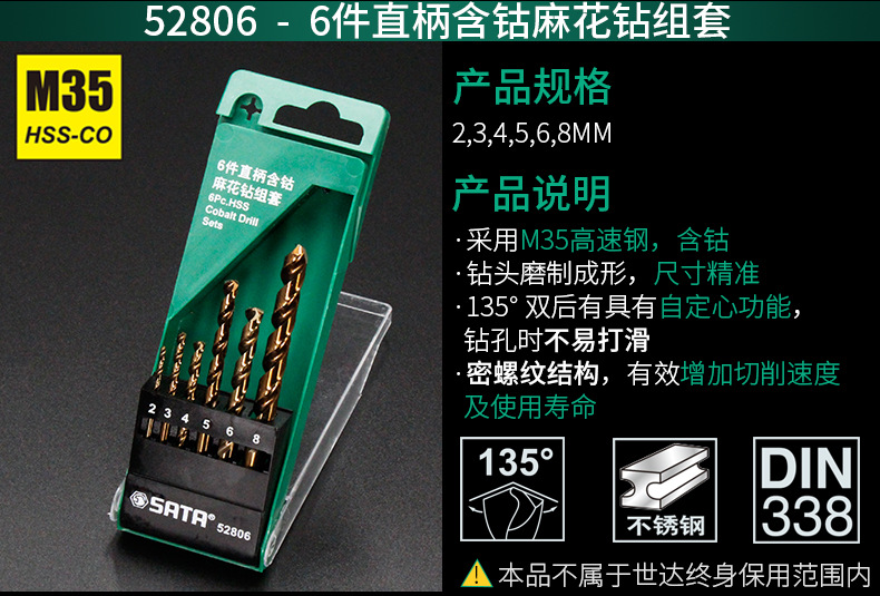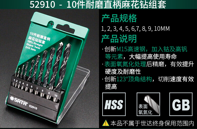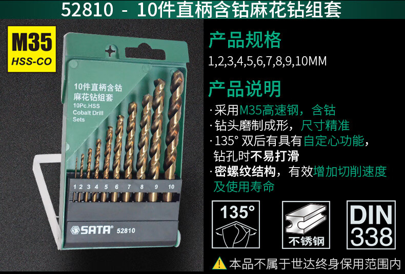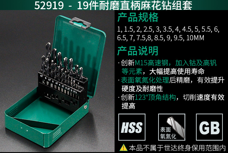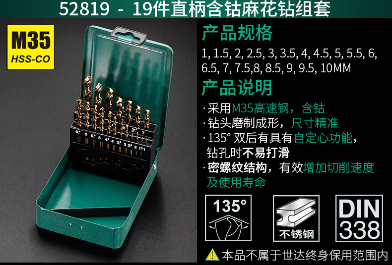 SATA 52819 High Hardness Wear-Resistant Stainless Steel Drill Bits 19 Pieces Straight Shank Cobalt Twist Drill Set 1mm-10mm