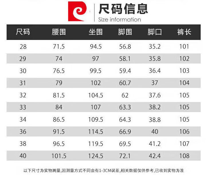 Outseam (cm) 99 cm 101.5 cm 104 cm 106.5 cm 109 cm