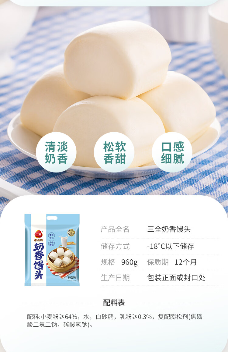 Sanquan milk-flavored steamed buns 960g, about 40 pieces, breakfast semi-finished products, children's milk steamed buns, pastry packs, New Year's gifts