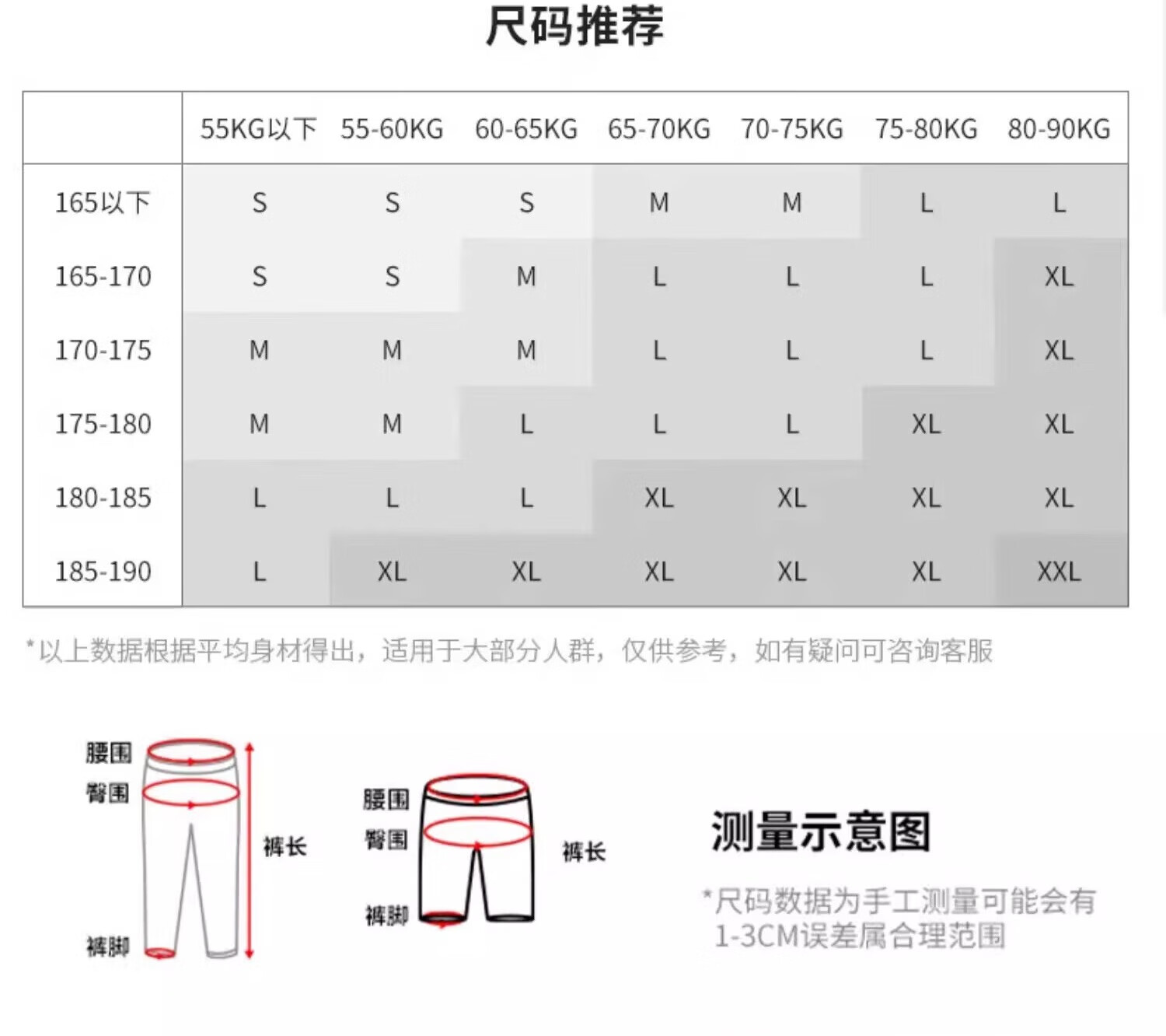 China (cm) 160-165/84-86 165-170 / 88-90 167-172 / 92-96 168-173 / 98-102 170-176 / 106-110