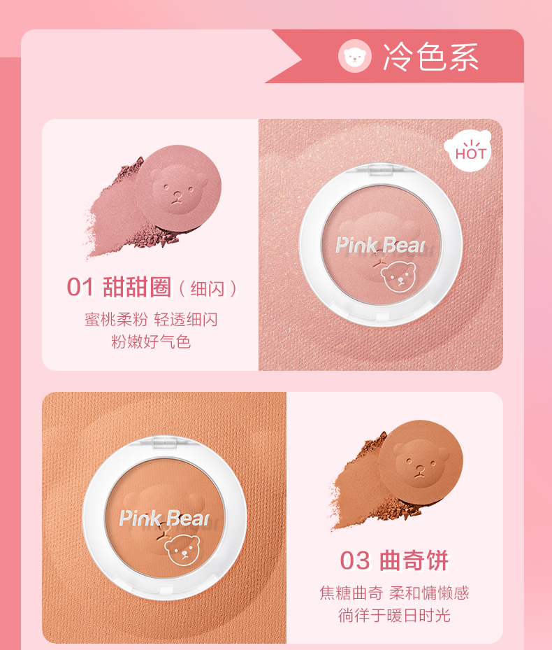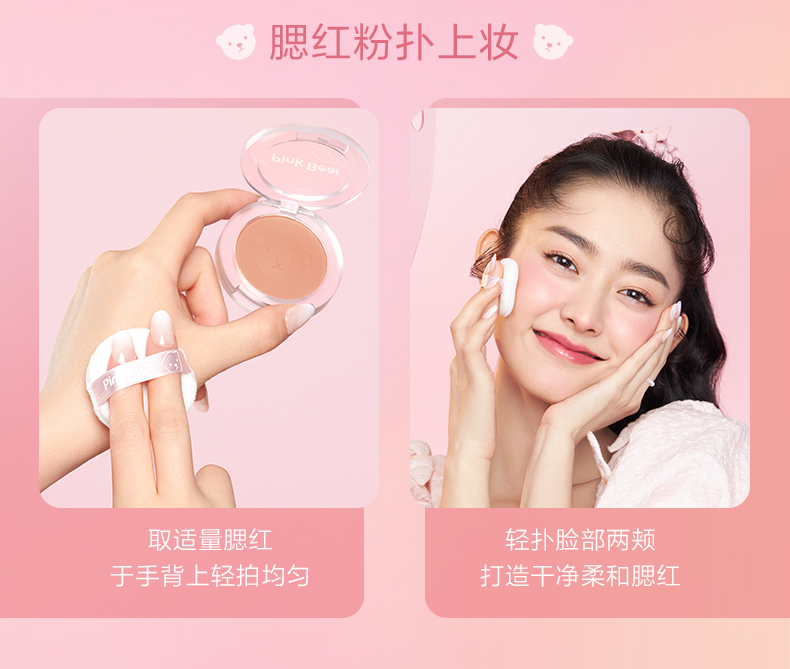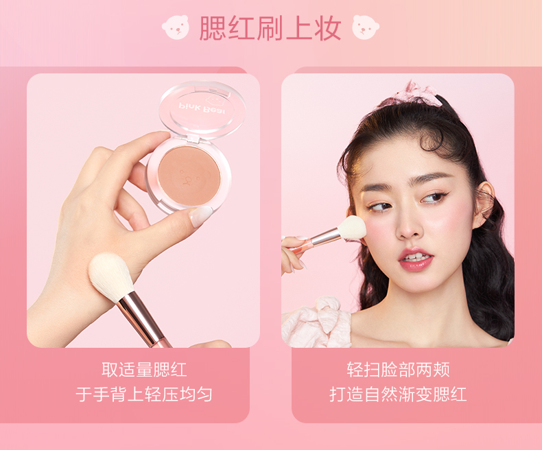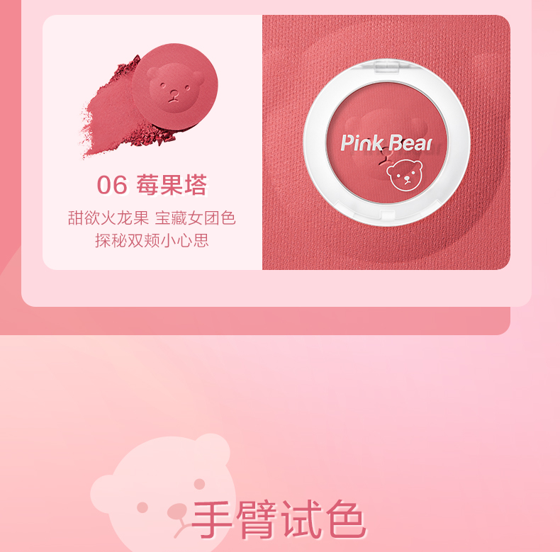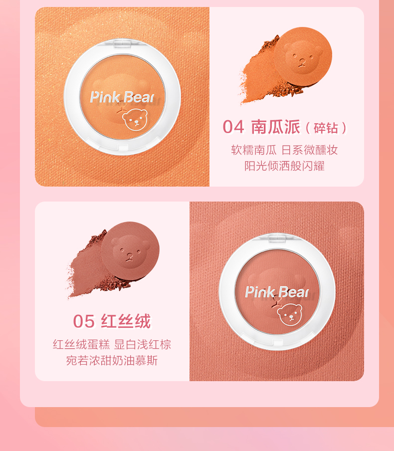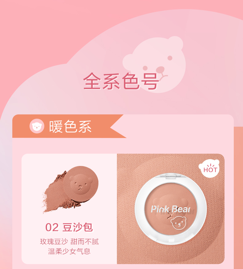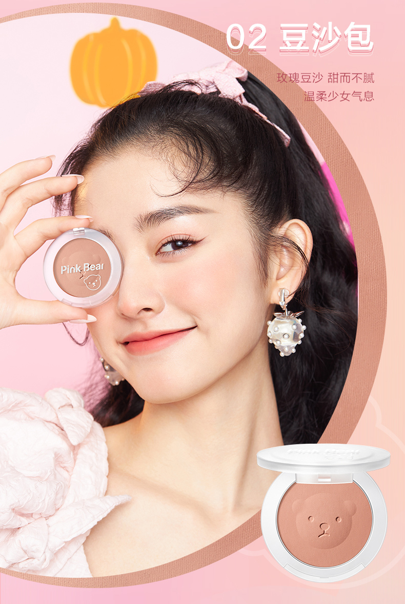 Pink Bear brightens skin tone, natural rouge powder for nude makeup, long-lasting color and rosiness, afternoon blush 02 red bean paste buns
