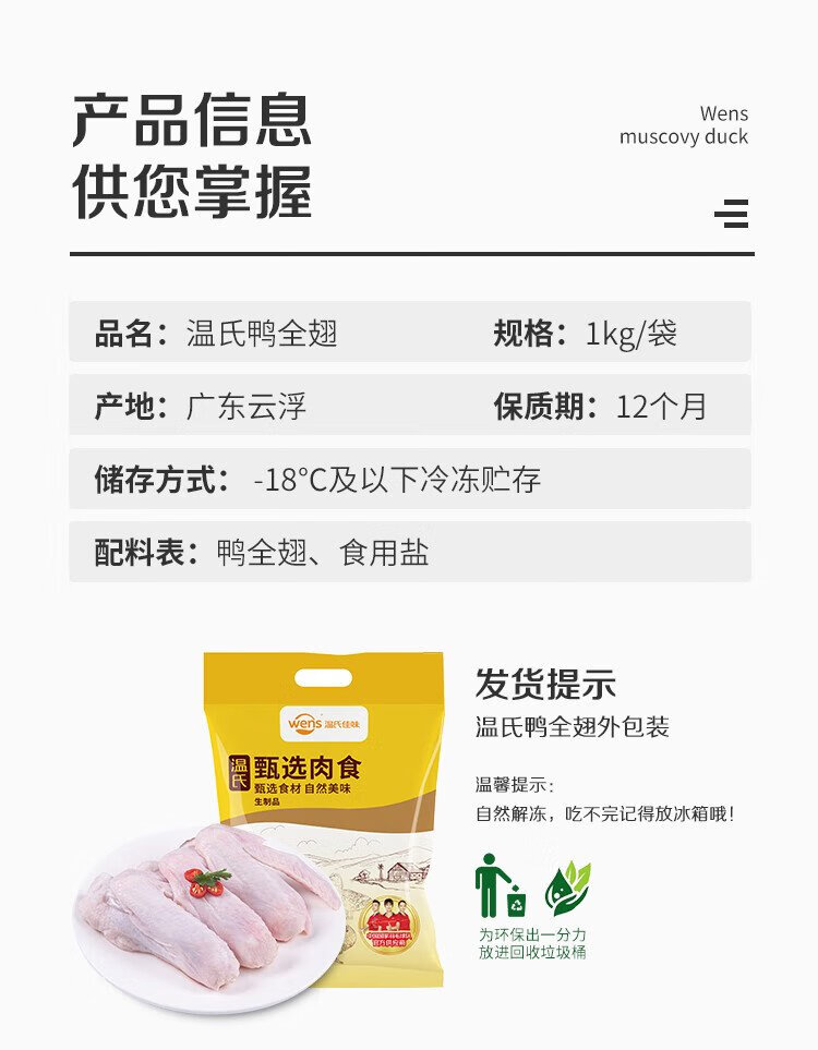 Wen's Duck Whole Wings 2Jin Jin is equal to 0.5 kg Frozen Duck Three-section Wings Duck Wings Duck Meat Fresh Duck Wings Three-section Duck Whole Wings