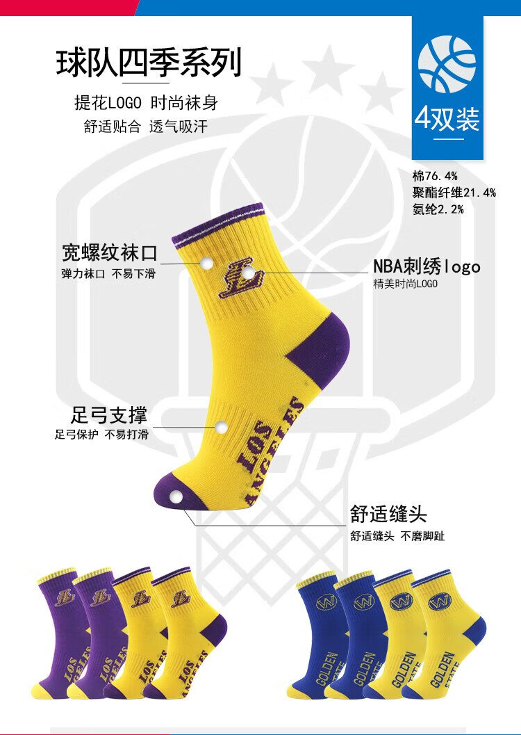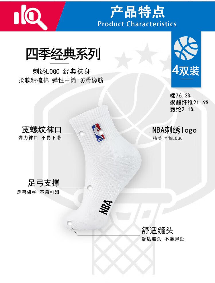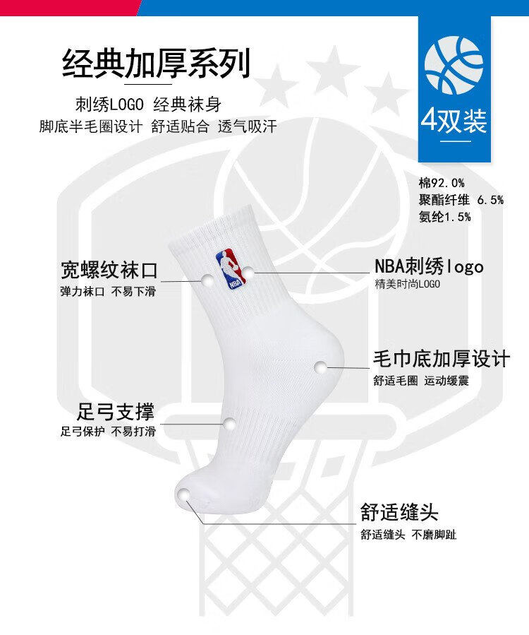 NBA mid-calf basketball running sports socks for men, women, children, older children, and students in autumn and winter, 4 pairs of comfortable and casual boneless cotton socks