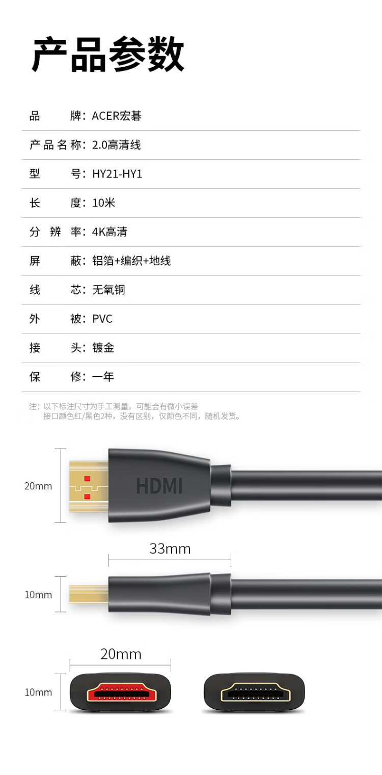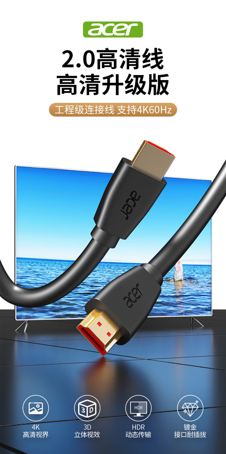 Acer HDMI cable version 2.0 4K ultra-high definition cable 10 meters 3D video cable engineering grade laptop monitor set-top box TV projector data connection cable