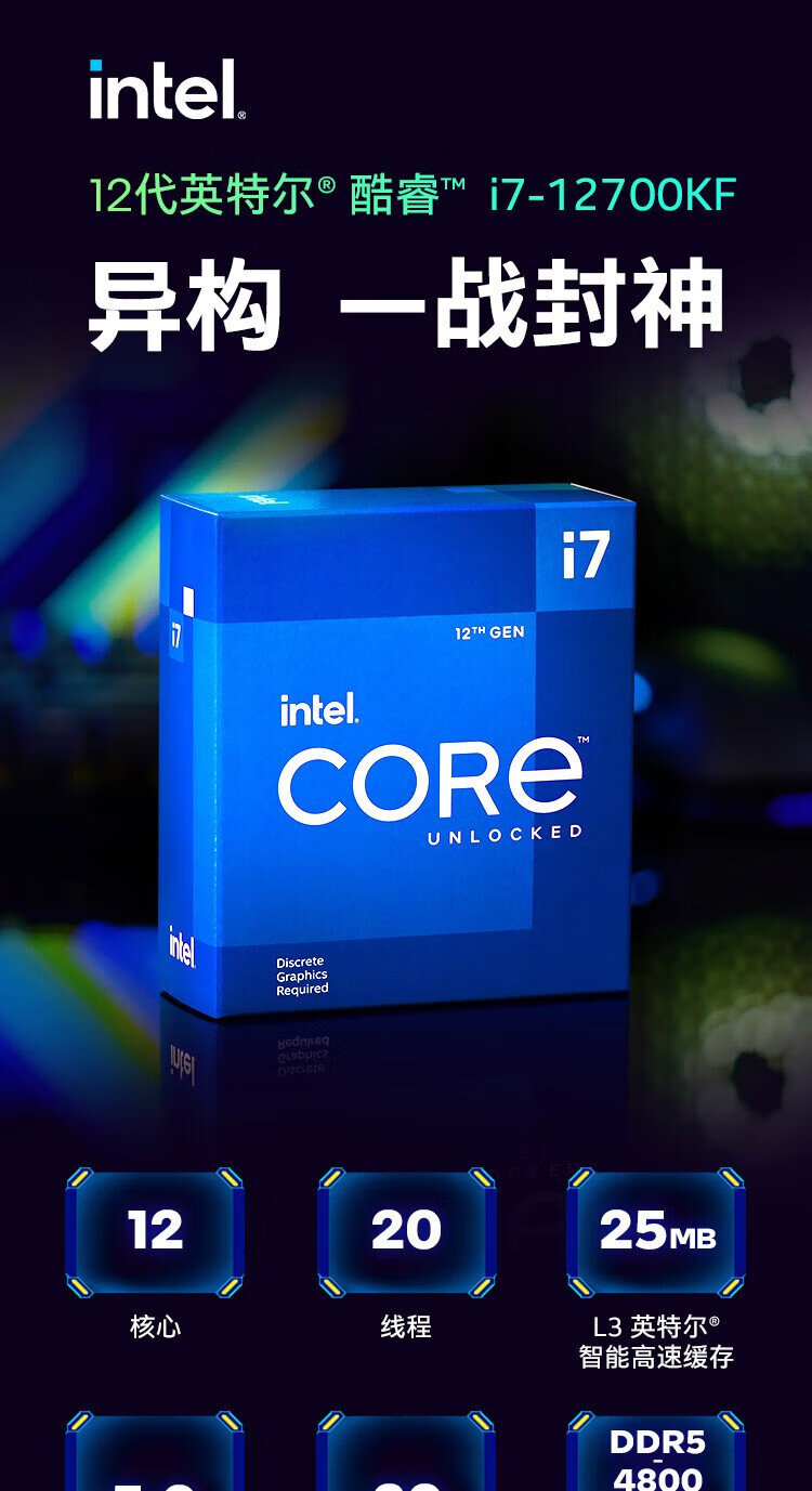 Intel (Intel) i7-12700KF Core 12th generation processor 12 cores 20 threads Turbo frequency up to 5.0Ghz 25M L3 cache desktop CPU